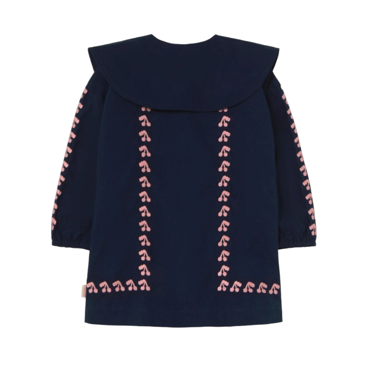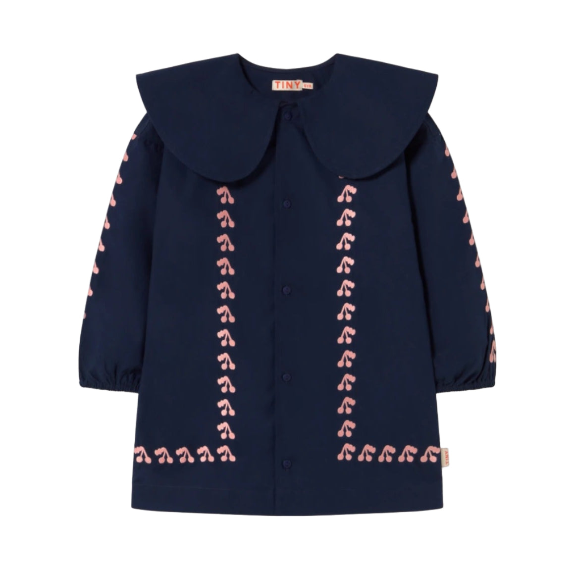 Item: The Mini Cherries Dress in navy features a cheerful cherry print and feminine shape with a wide, rounded neckline, long sleeves, and a practical front button placket. Elegant yet playful—perfect for both everyday wear and special moments.