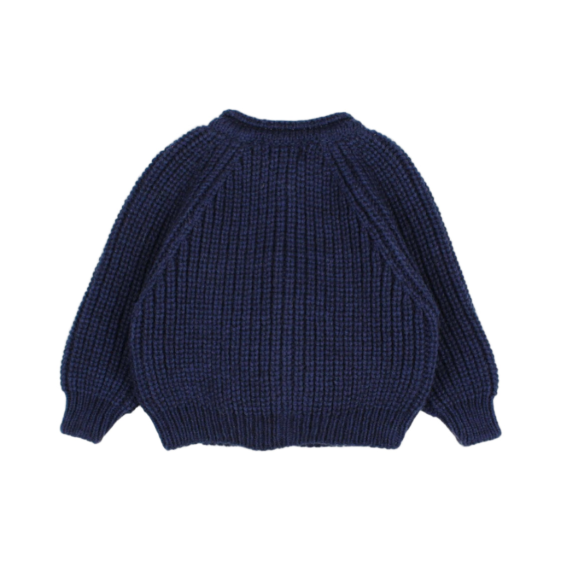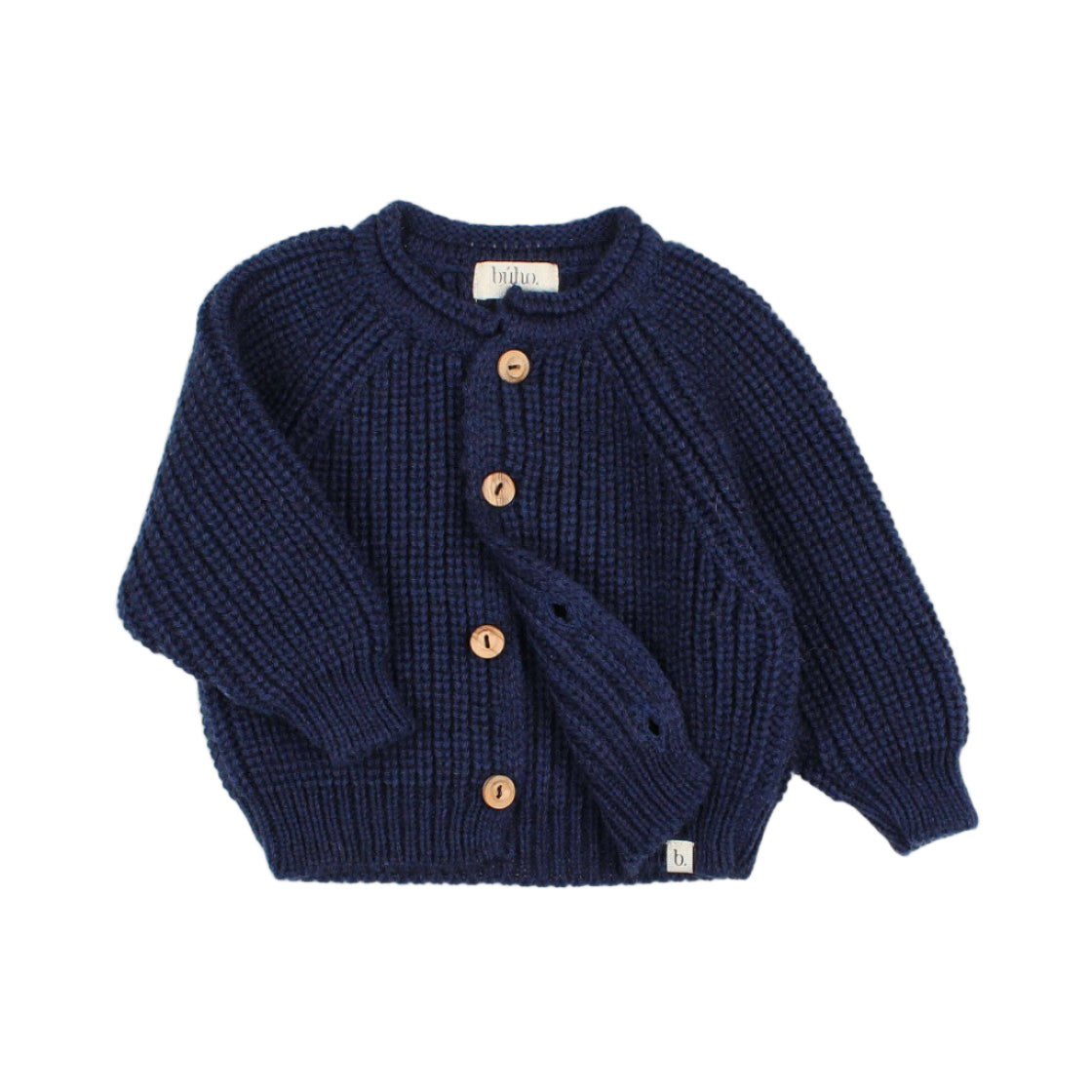 Item : Soft knitted cardigan. Round neck. Front wood buttons fastening. Ribbed cuffs and hem. Tab label detail on hem.