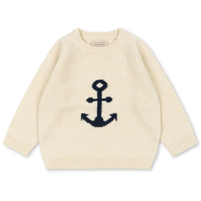 Item: Soft knit sweater in a warm wool blend with a decorative anchor in front.