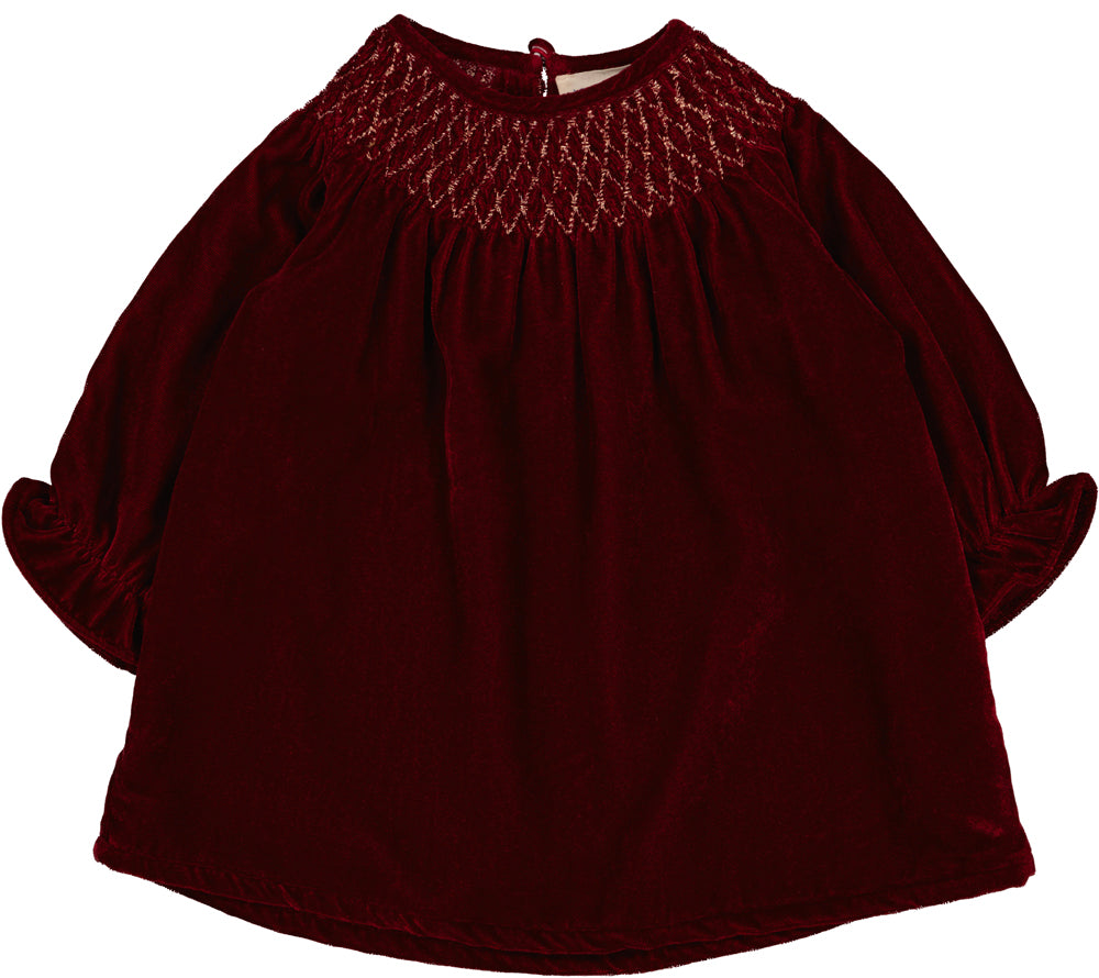 Item : Festive dress with smocked breastplate, gold thread at chest, sleeves tightened with elastic and button placket at back