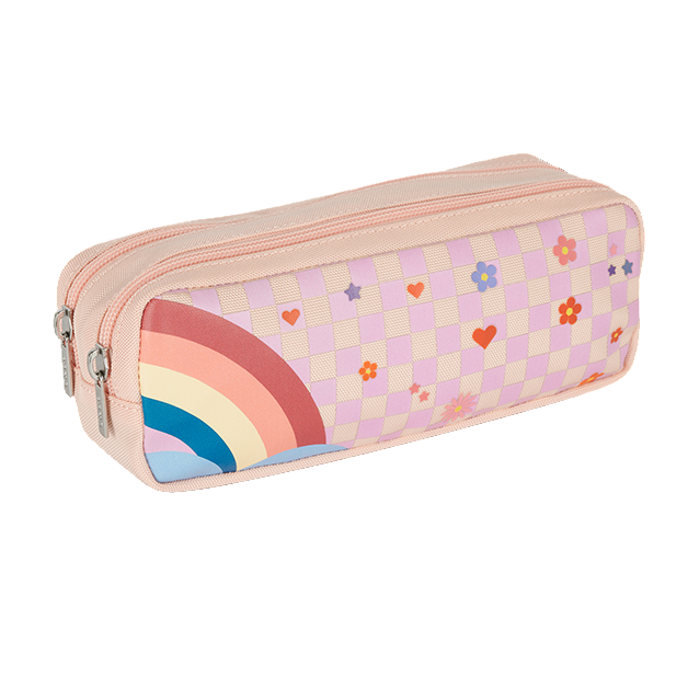 Item: Double-compartment pencil case for school, with pens on one side and crayons on the other! In the same print as the Happy Sky schoolbag. For a total look!