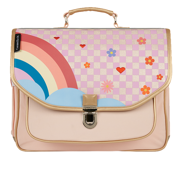 Item: This schoolbag is made from high-quality, water-repellent materials and designed for intensive use, the Happy Sky schoolbag from Caramel & cie is designed to be as light as possible. The seams are reinforced at wear points, and the water-repellent materials, back and sides are designed to protect the contents of the bag throughout a day at school. The rainbow print matches the colors of the handles, and the pink gingham pattern adds a vitaminized touch to the design.