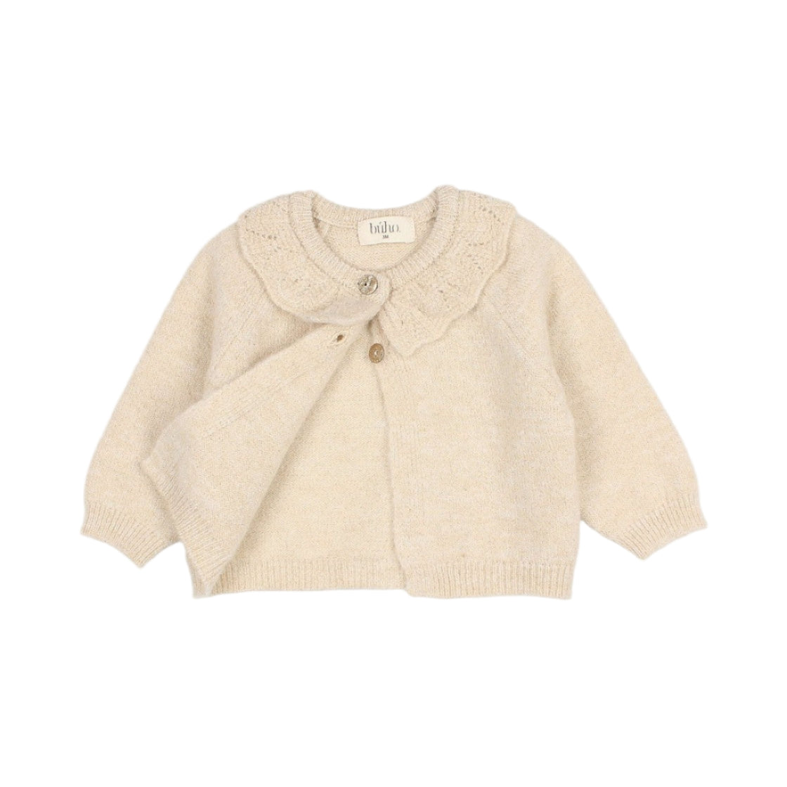 Item : Lurex knit cardigan. Baby collar with ruffles. Fastened with two front buttons. Ribbed cuffs and hem.