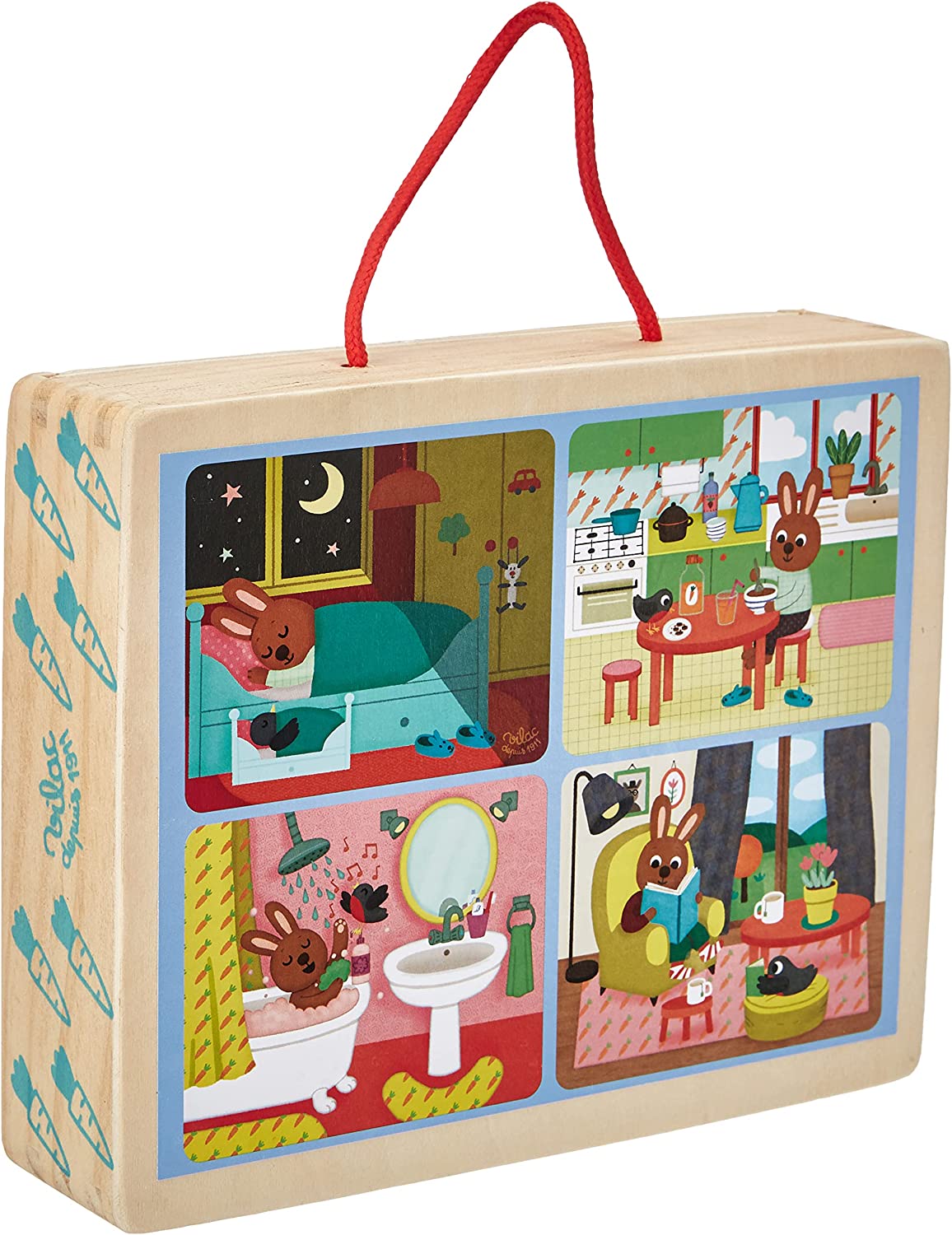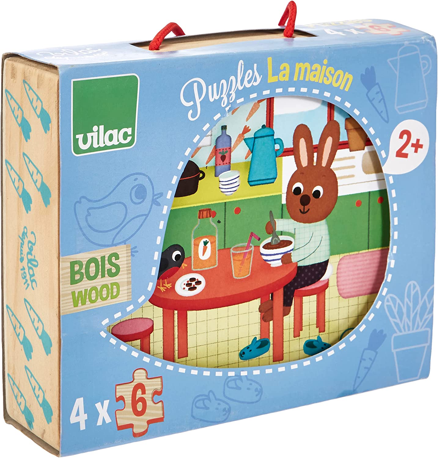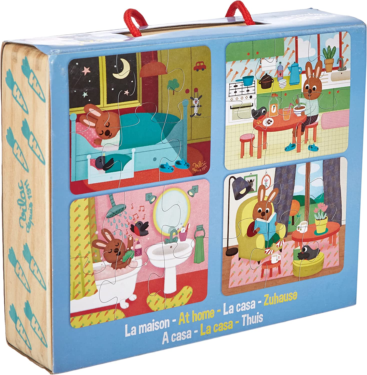 Four wooden puzzles of six pieces, on the theme of the house, sold in a beautiful illustrated wooden box.