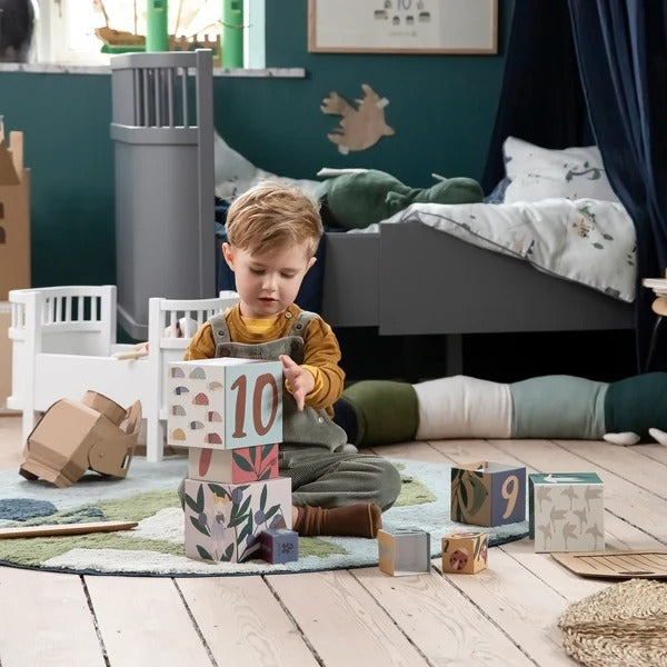 Item: Stacking blocks which can be used to build a tall tower or used as shape sorters. Here with prints from Sebra’s themes Dragon Tales and Pixie Land.
