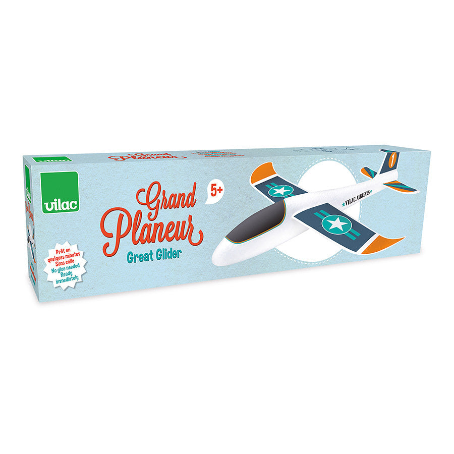 The Vilac Great Glider is a large lightweight polystyrene glider (approx. 50 × 48 × 12 cm) decorated with fun sticker designs, crafted for children aged around 5 years and up. It offers easy take-off action: simply grip the fuselage, run and launch for smooth, elegant glides. Ideal for outdoor play, it helps build coordination, gross motor skills, and a love for active play.