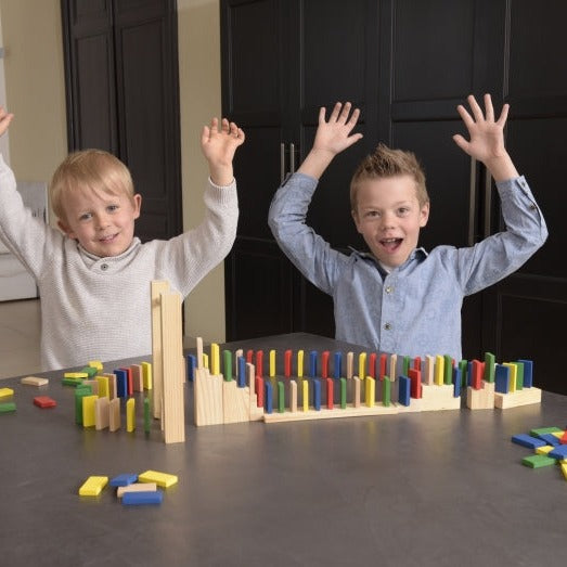 200 domino's to build a great track. A few bigger blocks and a bell to mark the end. Watch out! Who will make the first domino fall? There they go, till the bell rings. Dexterity and patience are required.