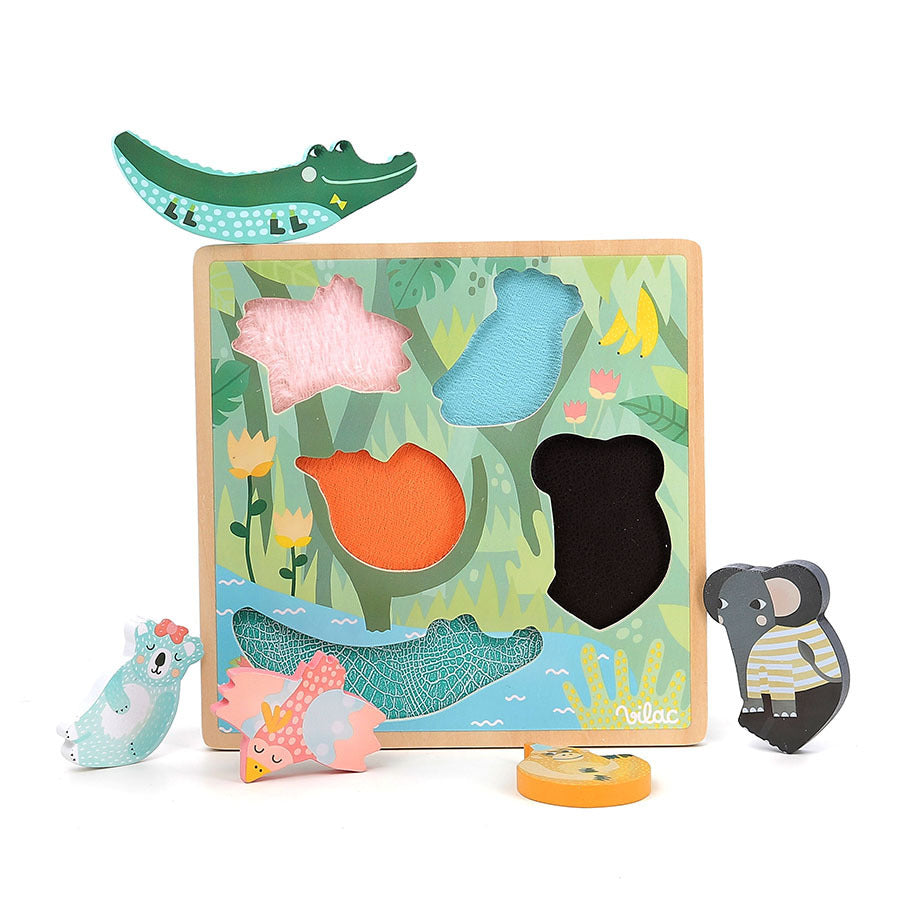 Explore the jungle with this tactile wooden puzzle beautifully illustrated by Michelle Carlslund. Featuring fun animals and various textures—soft, rough, fluffy, and more—it helps children develop their sense of touch, fine motor skills, observation, and concentration. A durable Montessori toy designed for discovery, reflection, and sensory exploration, with wooden pieces perfectly sized for little hands.