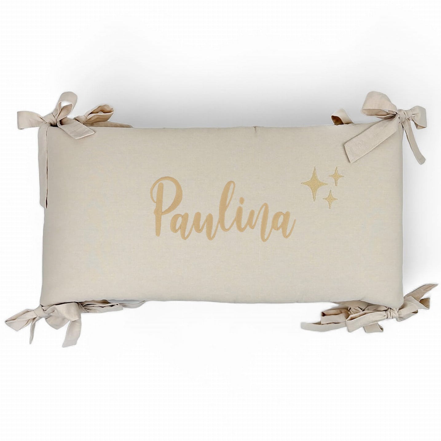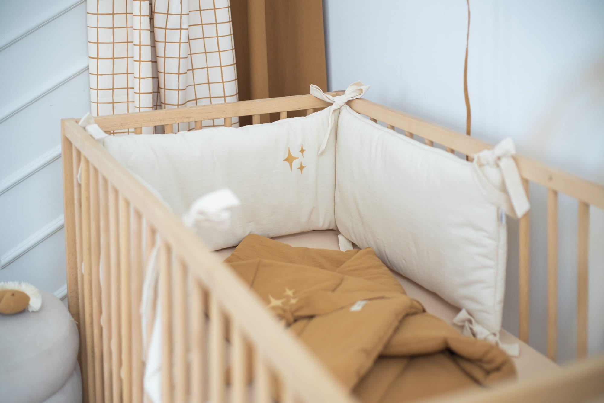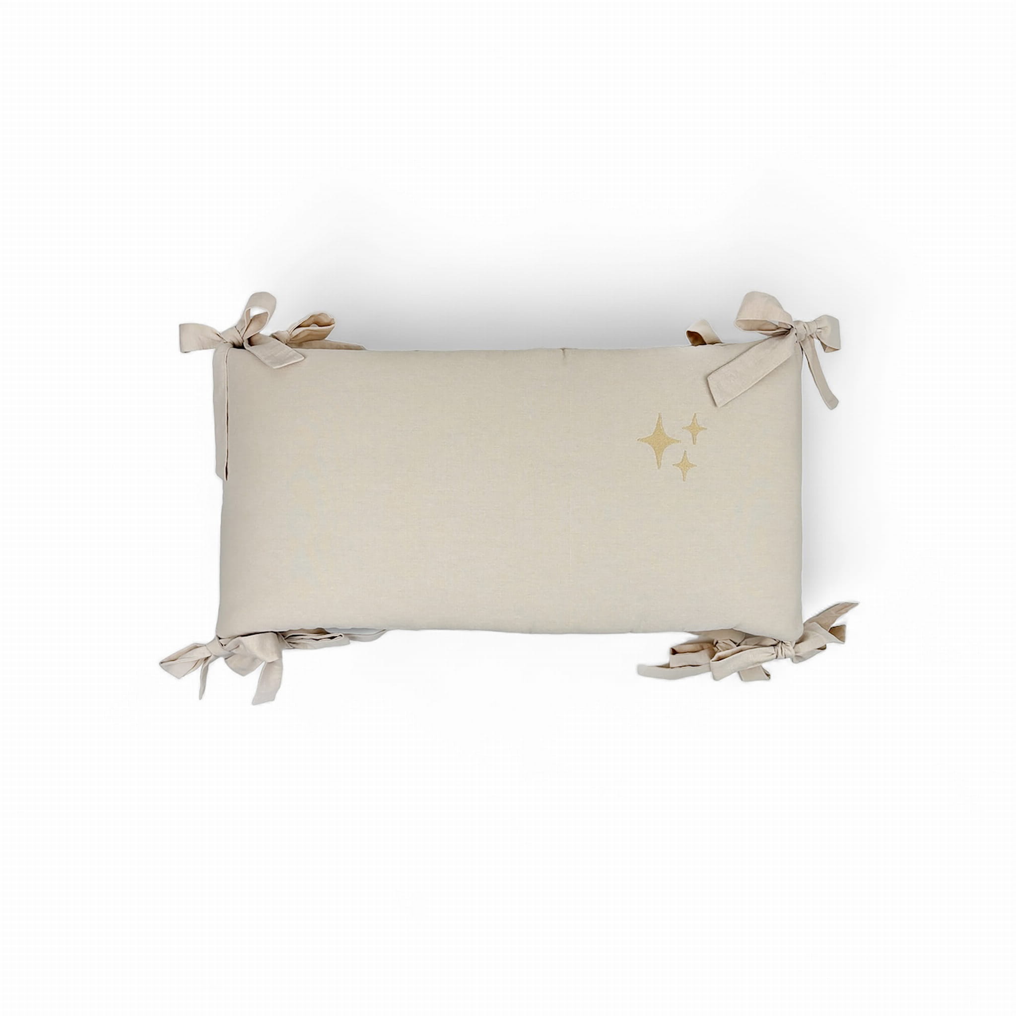 Item: The Cot Bumper in Washed Stars Natural is a stylish and functional addition to your baby's nursery. The bumper features a soft, slightly crumpled texture reminiscent of linen, providing both comfort and aesthetic appeal. It is filled with anti-allergic silicone, ensuring a safe environment for your little one. The bumper is adorned with decorative star embroidery on the middle panel and is equipped with ties that resemble beautiful bows when attached to the crib.