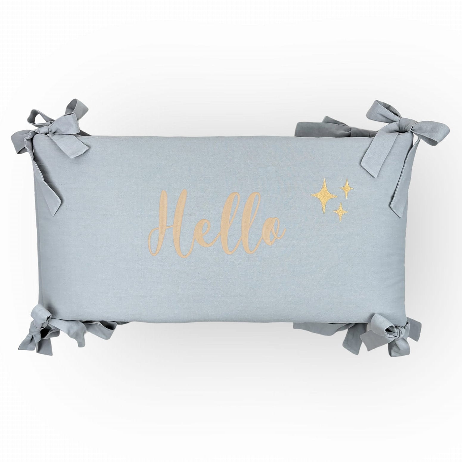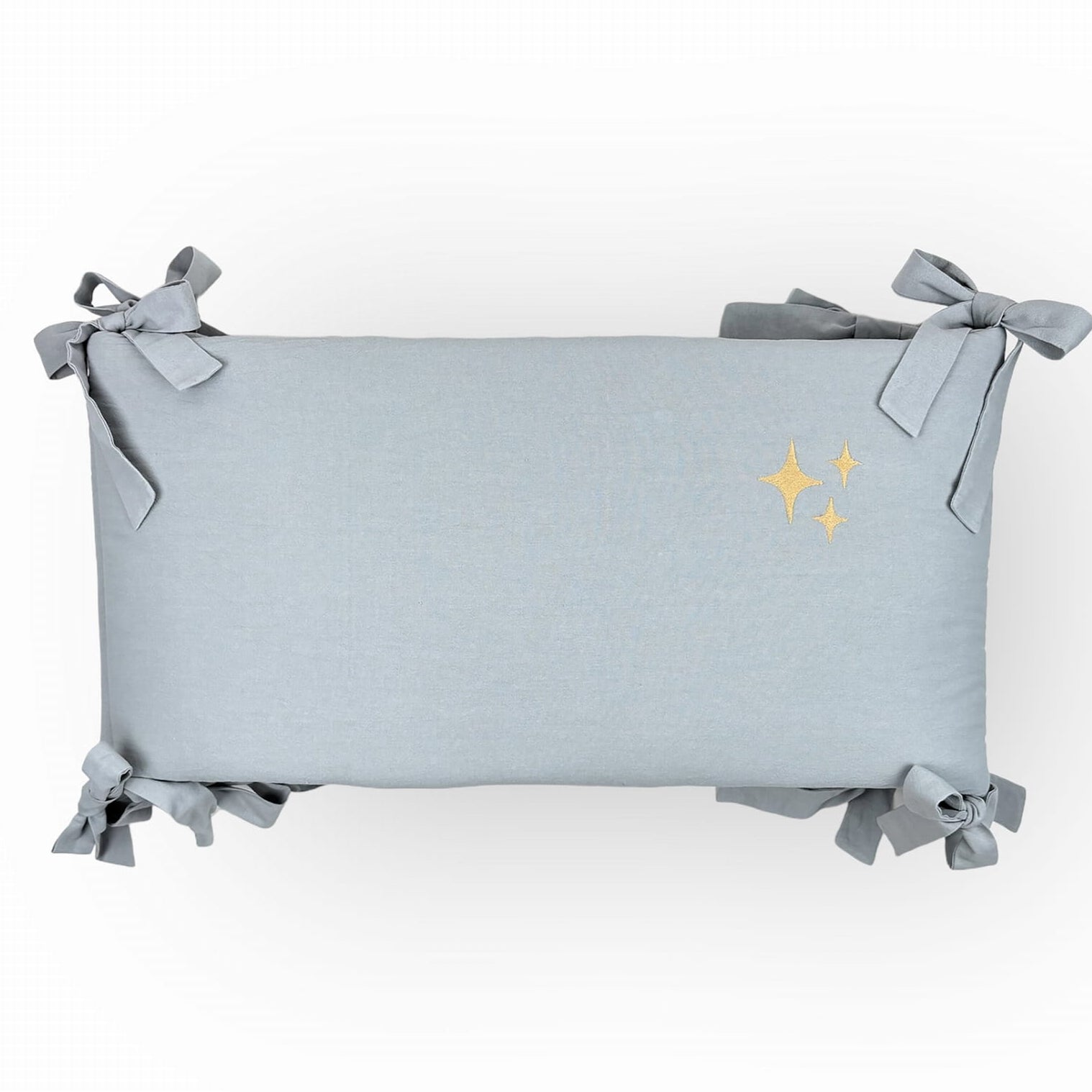 Item: A softly quilted crib bumper in a gentle washed grey scattered with tiny stars—subtle, calming, and easy to style. It wraps the crib with cushioned comfort and a refined, understated look that pairs beautifully with neutrals or bolder prints. The muted palette adds depth without overwhelming the space, creating a cozy, serene backdrop for naps and nighttime routines while tying the nursery décor together with quiet charm.