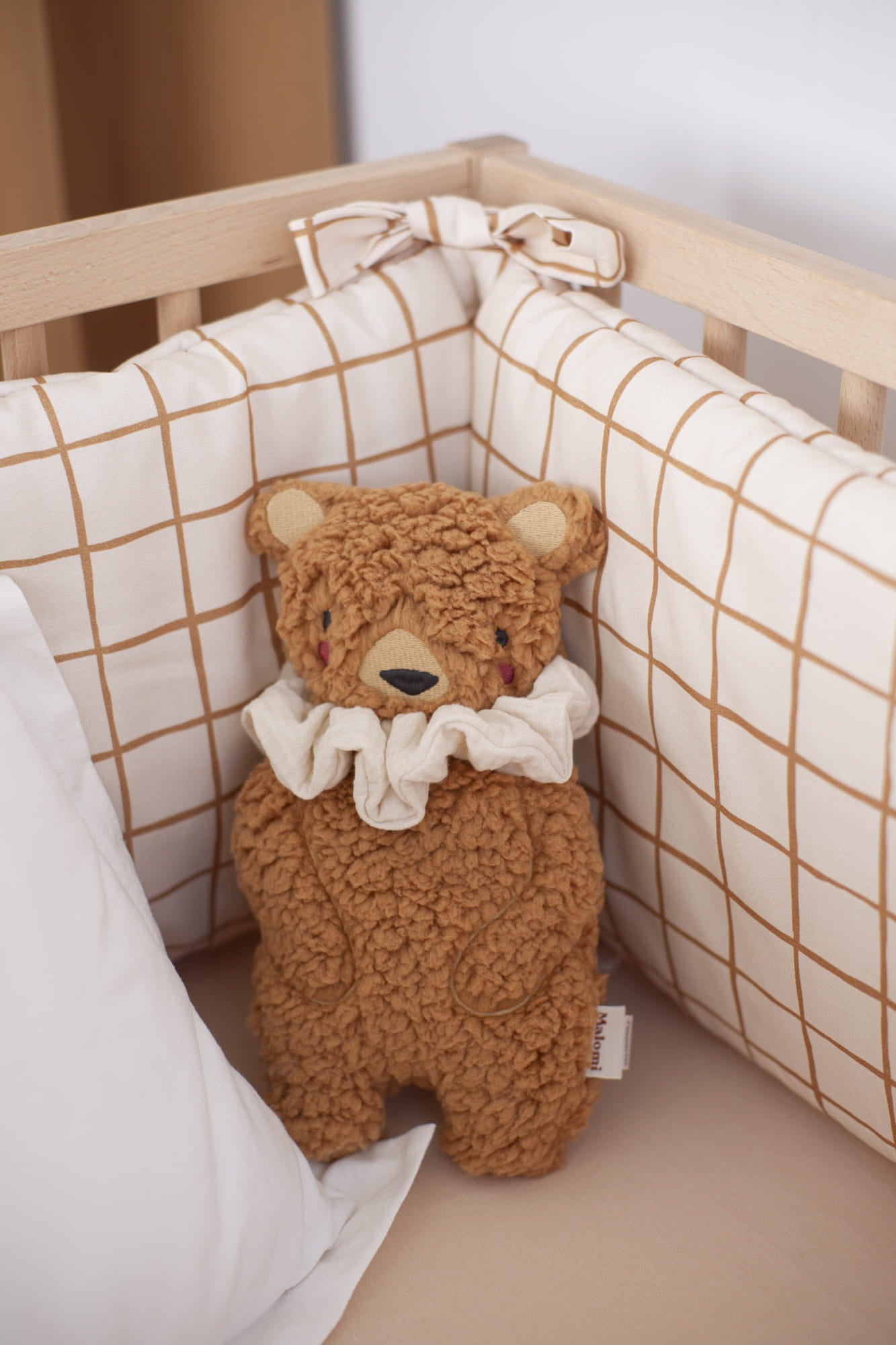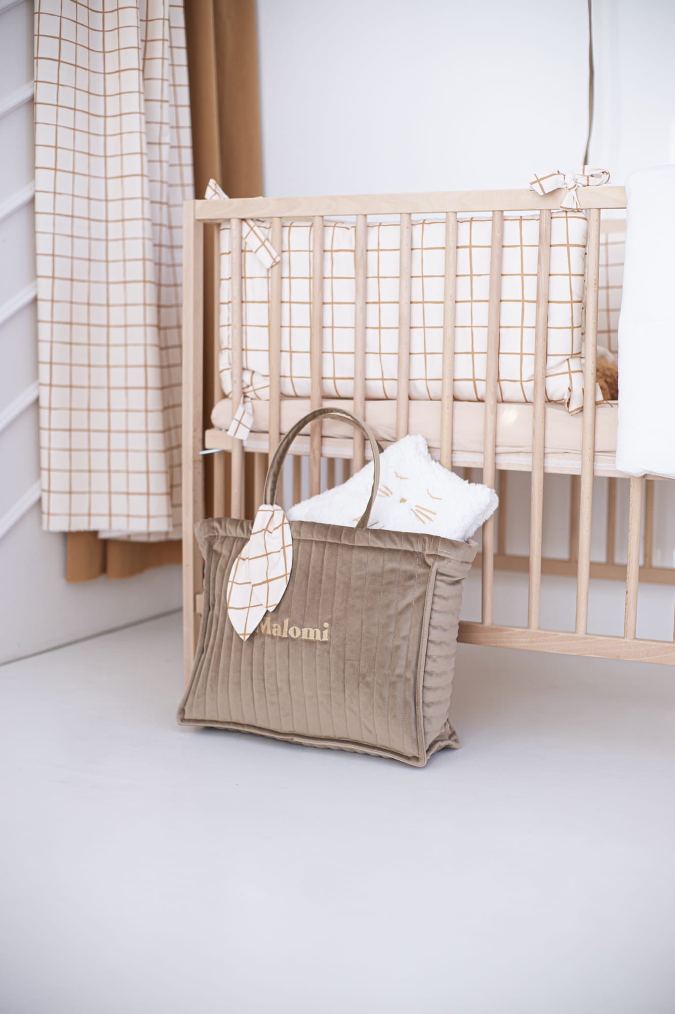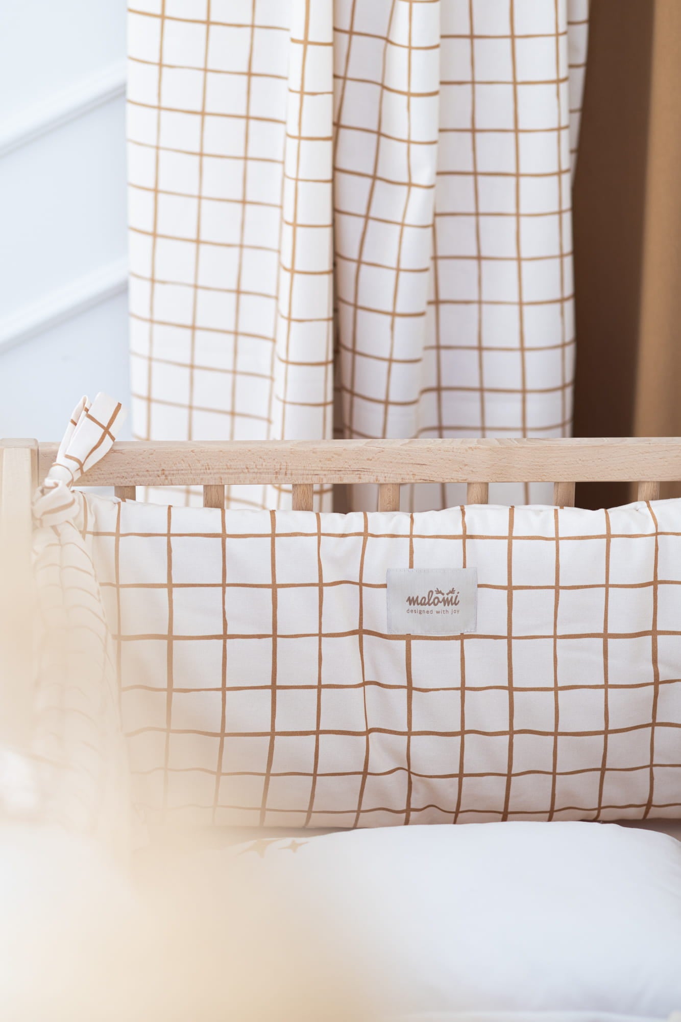 Item: The Cot Bumper in Camel Check is a stylish and functional addition to your baby's nursery. It features a proprietary checkered pattern and is filled with anti-allergic silicone, ensuring a safe and comfortable environment for your little one. The bumper is quilted at the folds and equipped with decorative ties that resemble beautiful bows when tied to the cot. It provides protection against unwanted bumps and enhances your baby's sleep quality. Oeko-Tex certified, it is free from harmful chemicals.