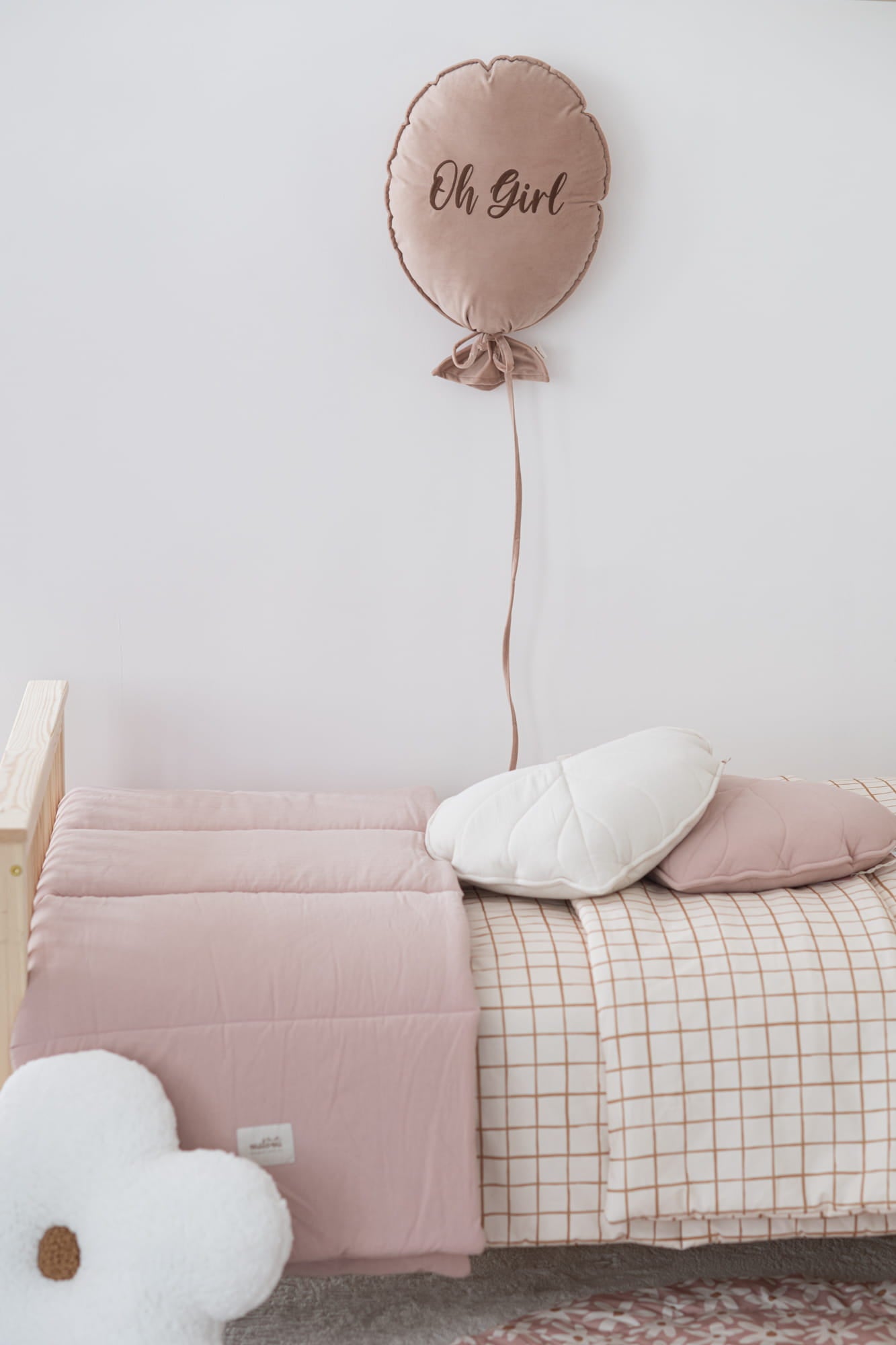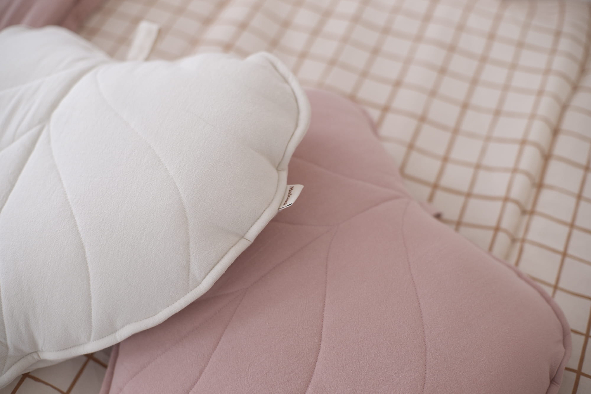 Item: The Leaf Pillow is a decorative cushion designed to add a whimsical touch to your child's room. Shaped like a leaf, it features a subtle embossed pattern and a small handle on the back, allowing it to be hung on the wall as part of the room's decor. Filled with hypoallergenic silicone, the pillow offers a soft and safe option for children. It is Oeko-Tex certified, ensuring it is free from harmful chemicals. This pillow combines functionality with playful design, making it a delightful addition to any nursery or child's bedroom.