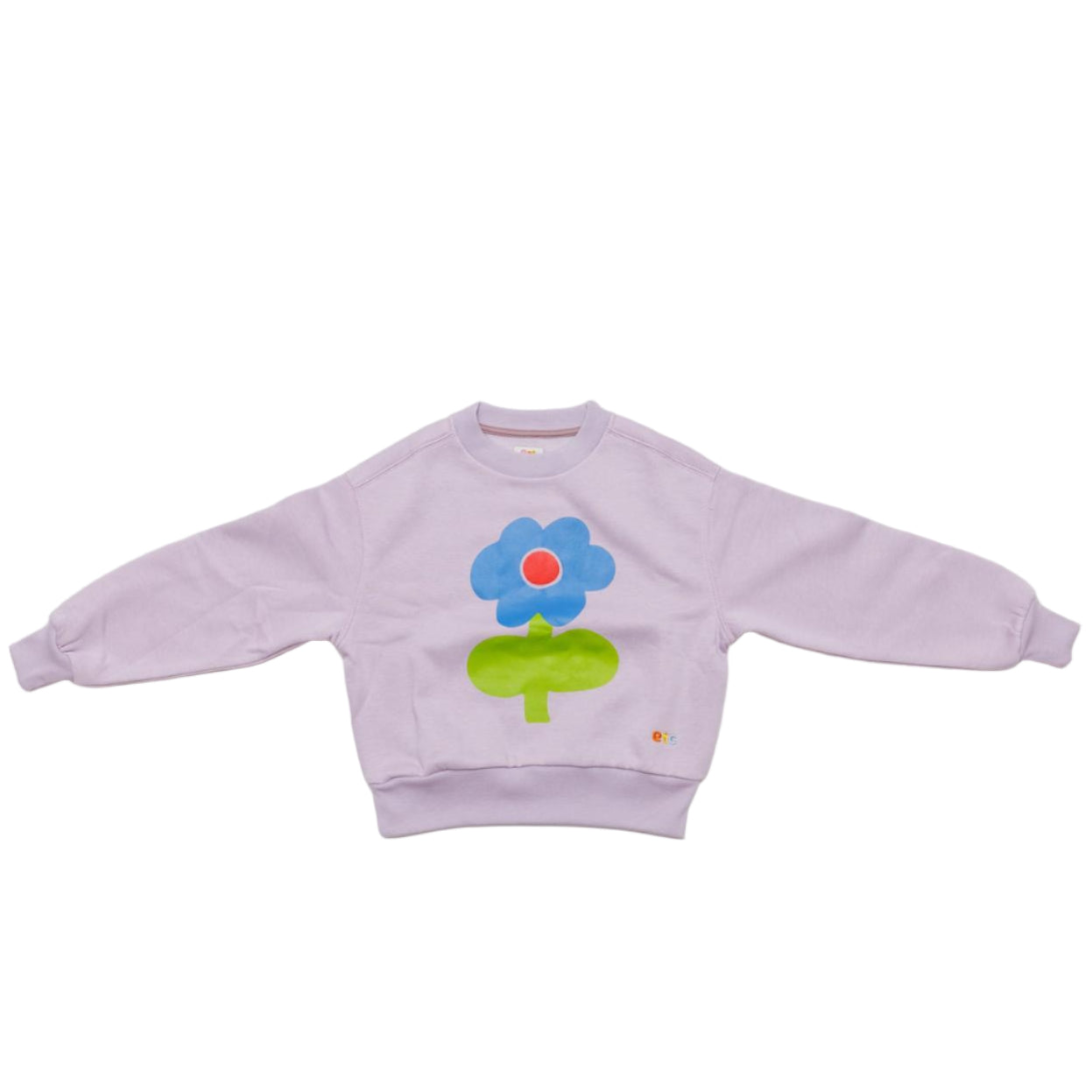 Item: This cozy lilac sweatshirt brings joy and comfort to your everyday look featuring a playful graphic of a bright blue flower with a red center and bold green leaves, it adds a fun pop of color to your wardrobe. Made from soft, high-quality fabric with a relaxed fit, ribbed cuffs, and hem, this sweatshirt is perfect for both lounging and casual outings