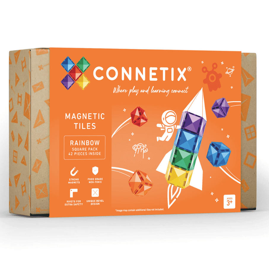 Boost your magnetic tile play and expand the possibilities for creativity and learning with CONNETIX! Featuring both large and standard square tiles in every rainbow colour, the CONNETIX 42 Piece Rainbow Square Pack can both kick start and expand existing collections. Experience open-ended play and STEAM learning potential and see how CONNETIX are where play and learning connect.