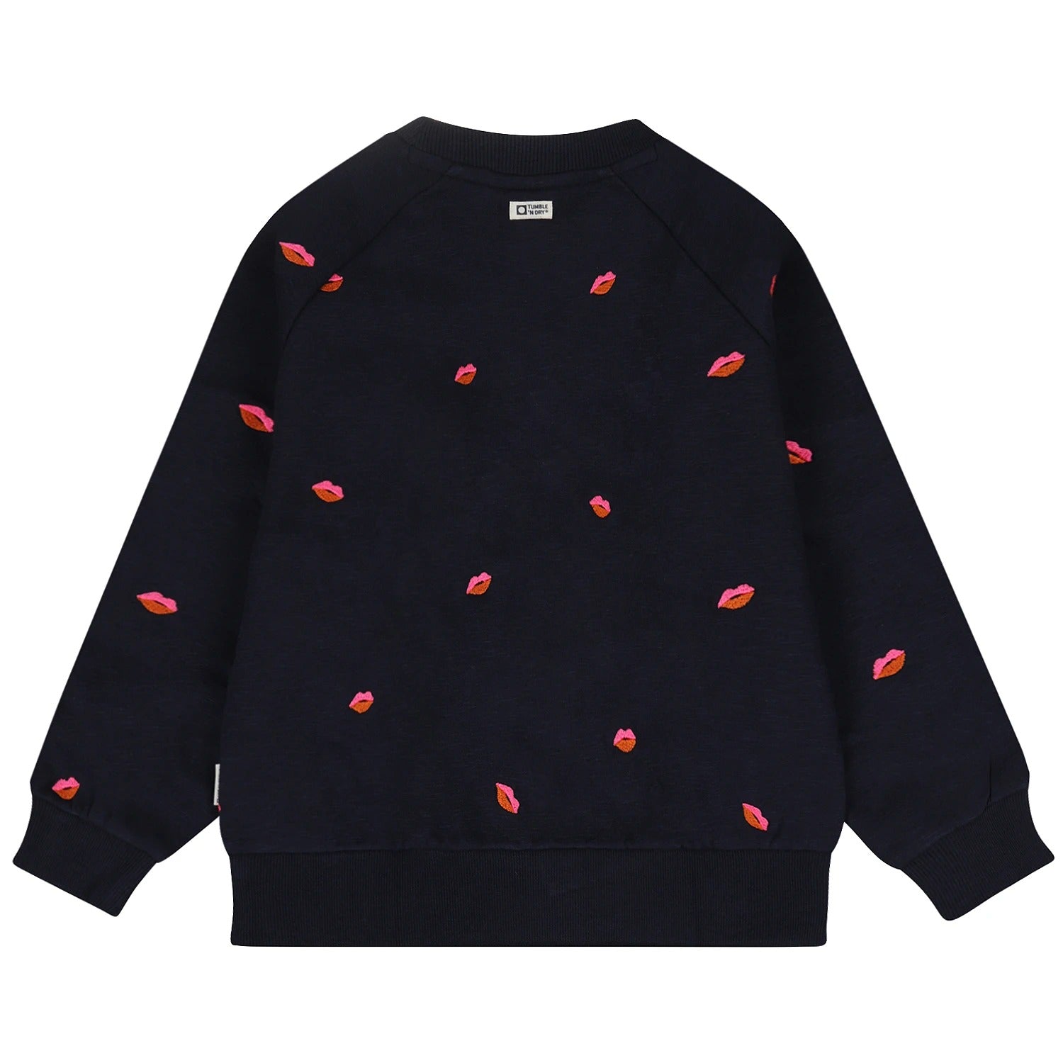 Item: This dark blue sweater has an oversized fit, raglan sleeves, sturdy ribbed cuffs and an all-over embroidery of lips.