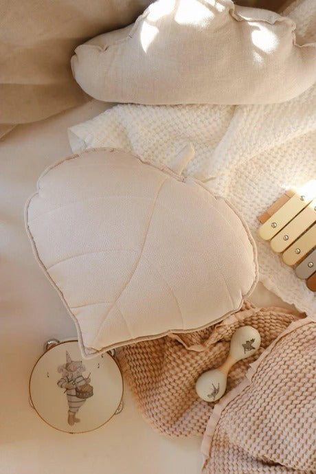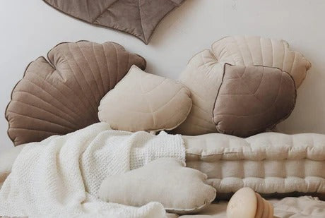 Item: A boho-chic, leaf-shaped cushion crafted from soft cream velvet that adds a touch of natural elegance to any room.