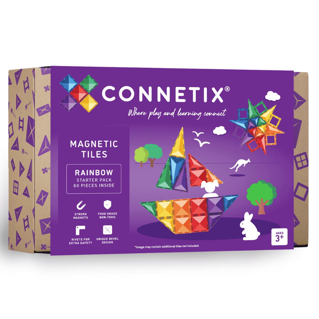 Discover open-ended play and learning with our 60 Piece Rainbow Starter Pack! Featuring large and small squares, plus three types of triangles in six vibrant rainbow colors, this pack is the perfect introduction to CONNETIX play or as an addition to growing magnetic tile collections. Create symmetry and balance with an evenly distributed amount of those vibrant rainbow colors you love!