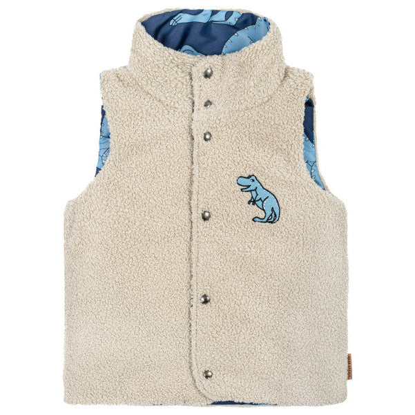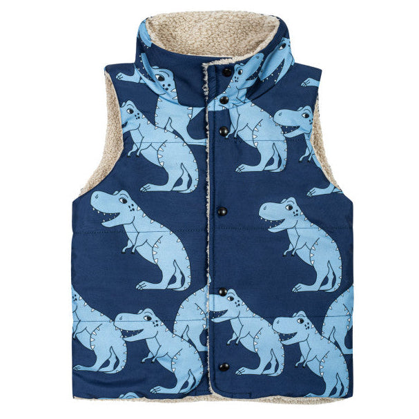 Item: This vest features a fun dinosaur graphic of the T-REX print on one side and a clean solid tone on the other, offering two distinct looks in one piece. Designed for layering, it instantly adds character to any outfit while keeping things practical and stylish.
