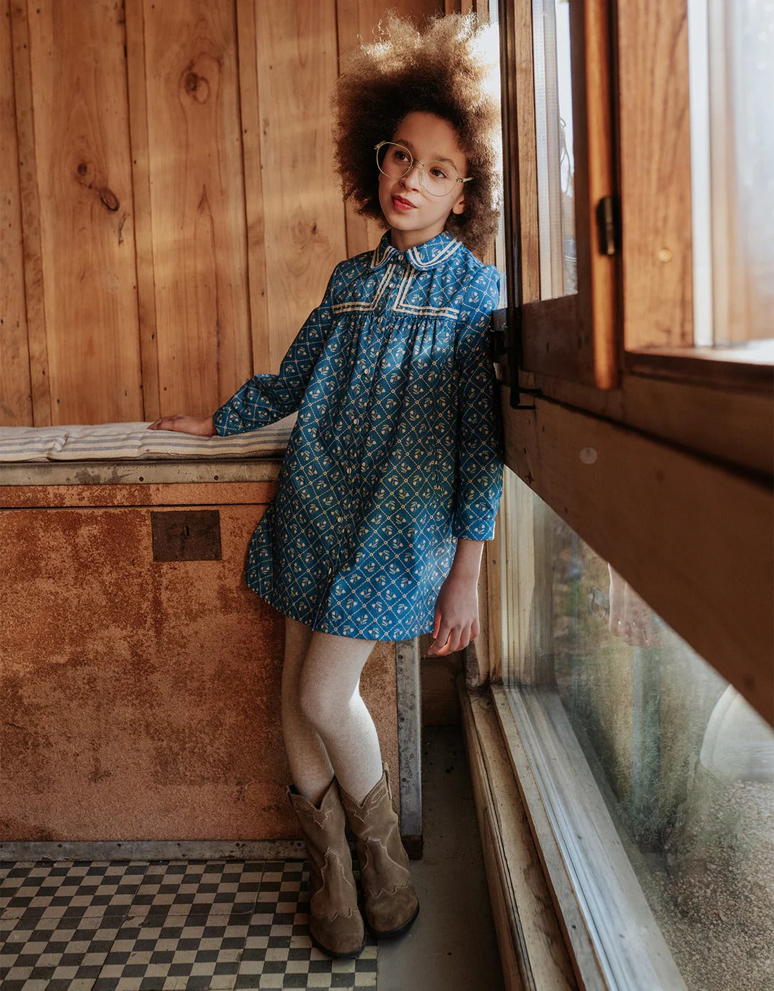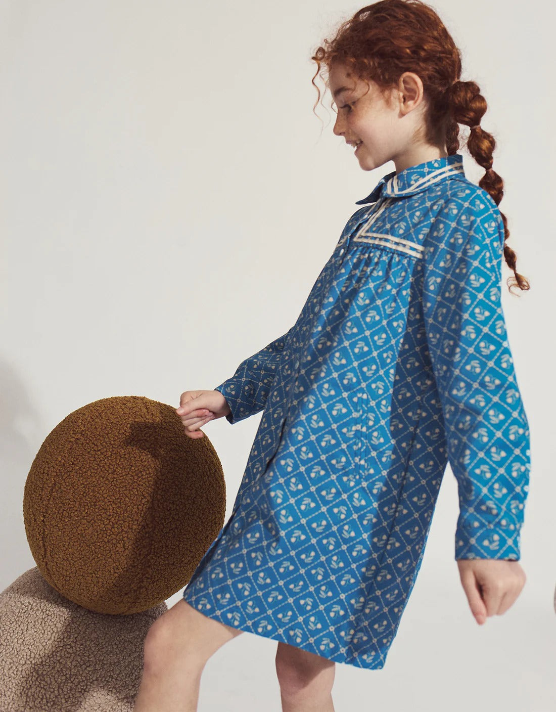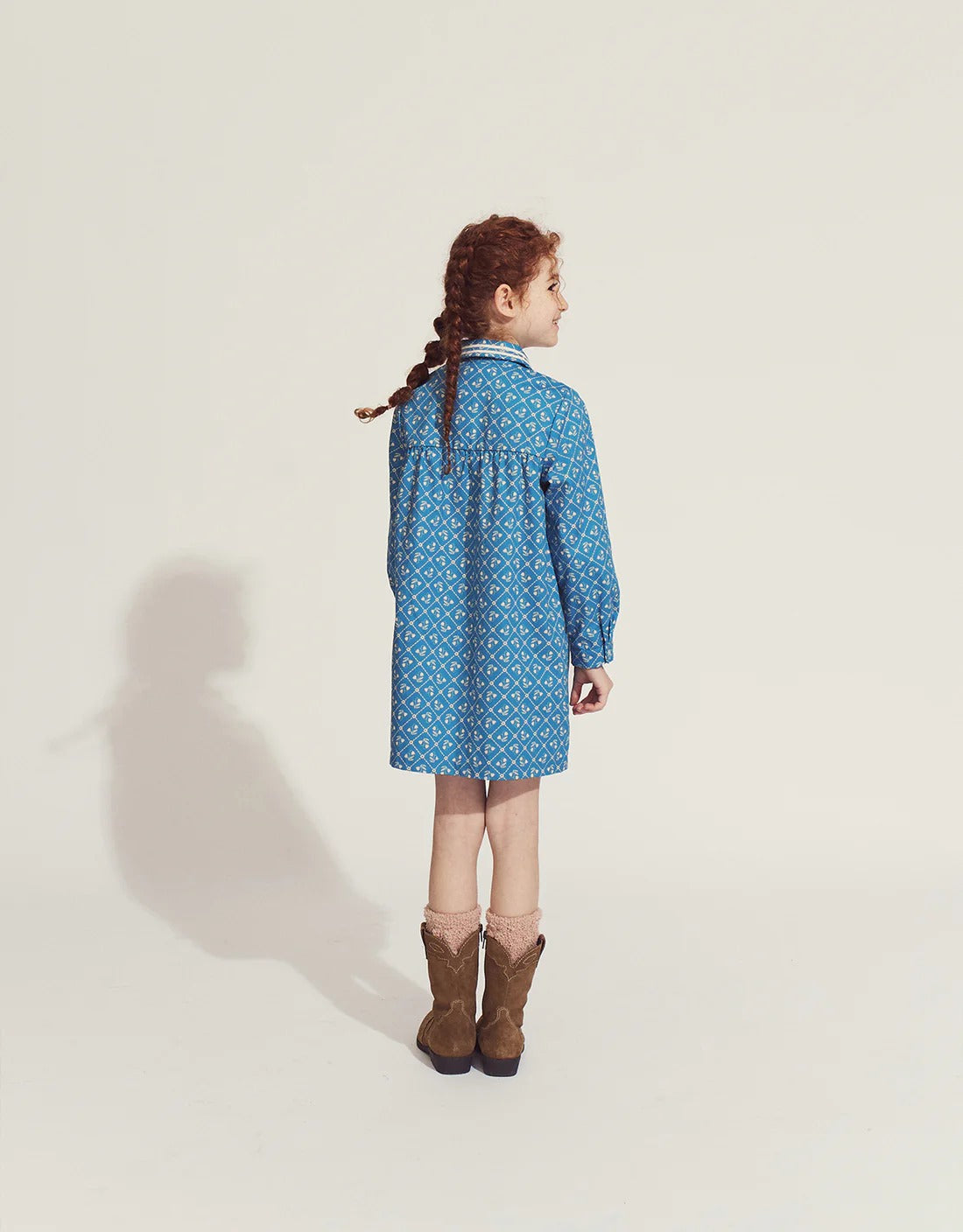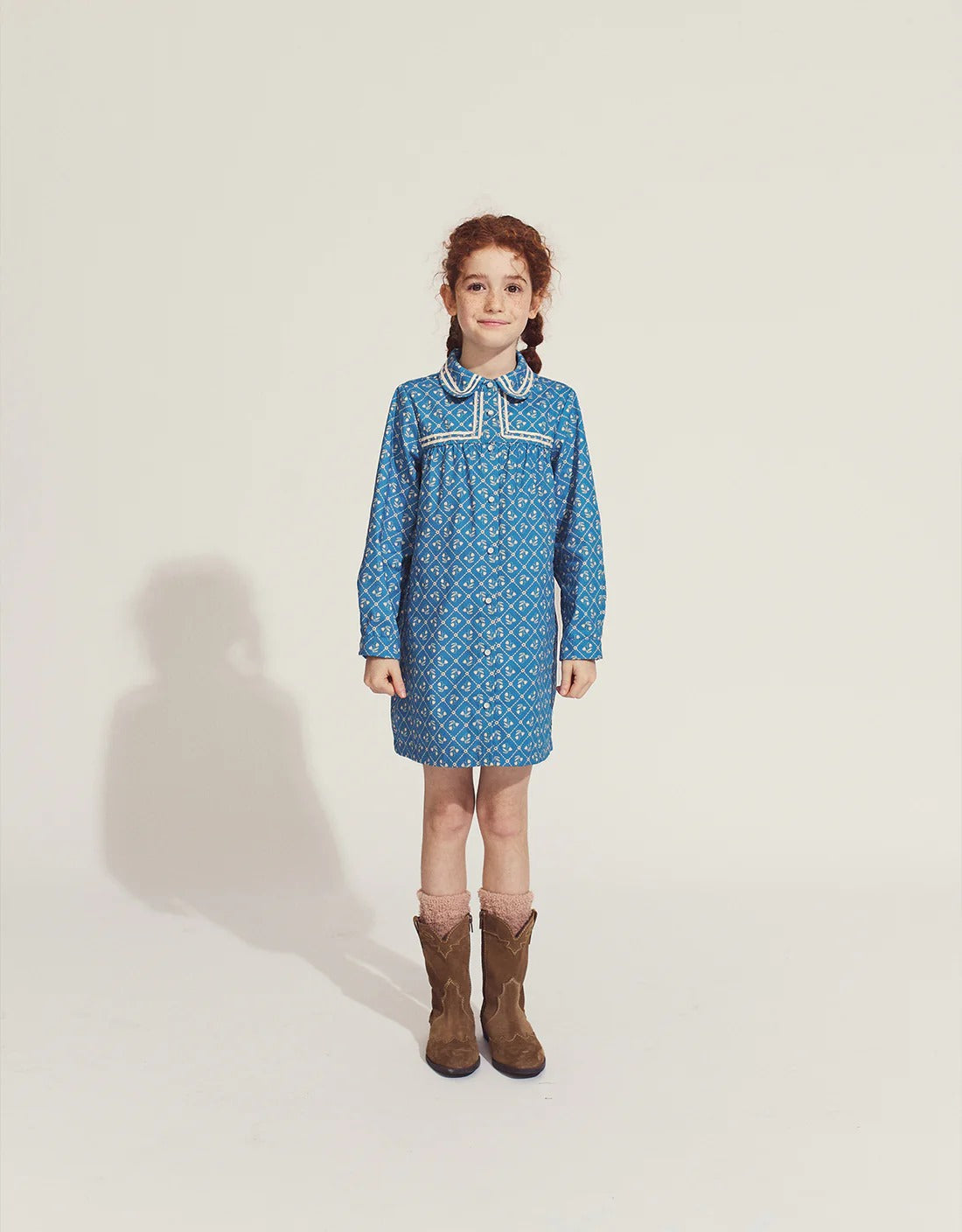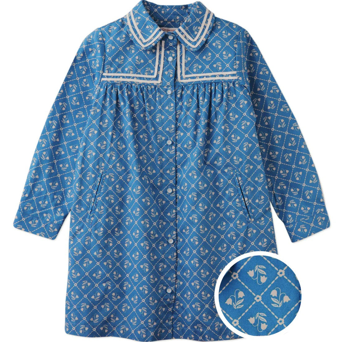 Item: The Lei Long Sleeves Dress with a contrast tape accent lets your little girl bloom with its charming Blue fields pattern.