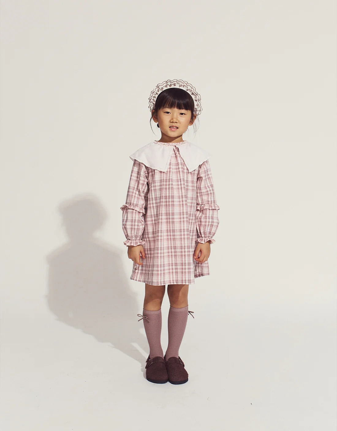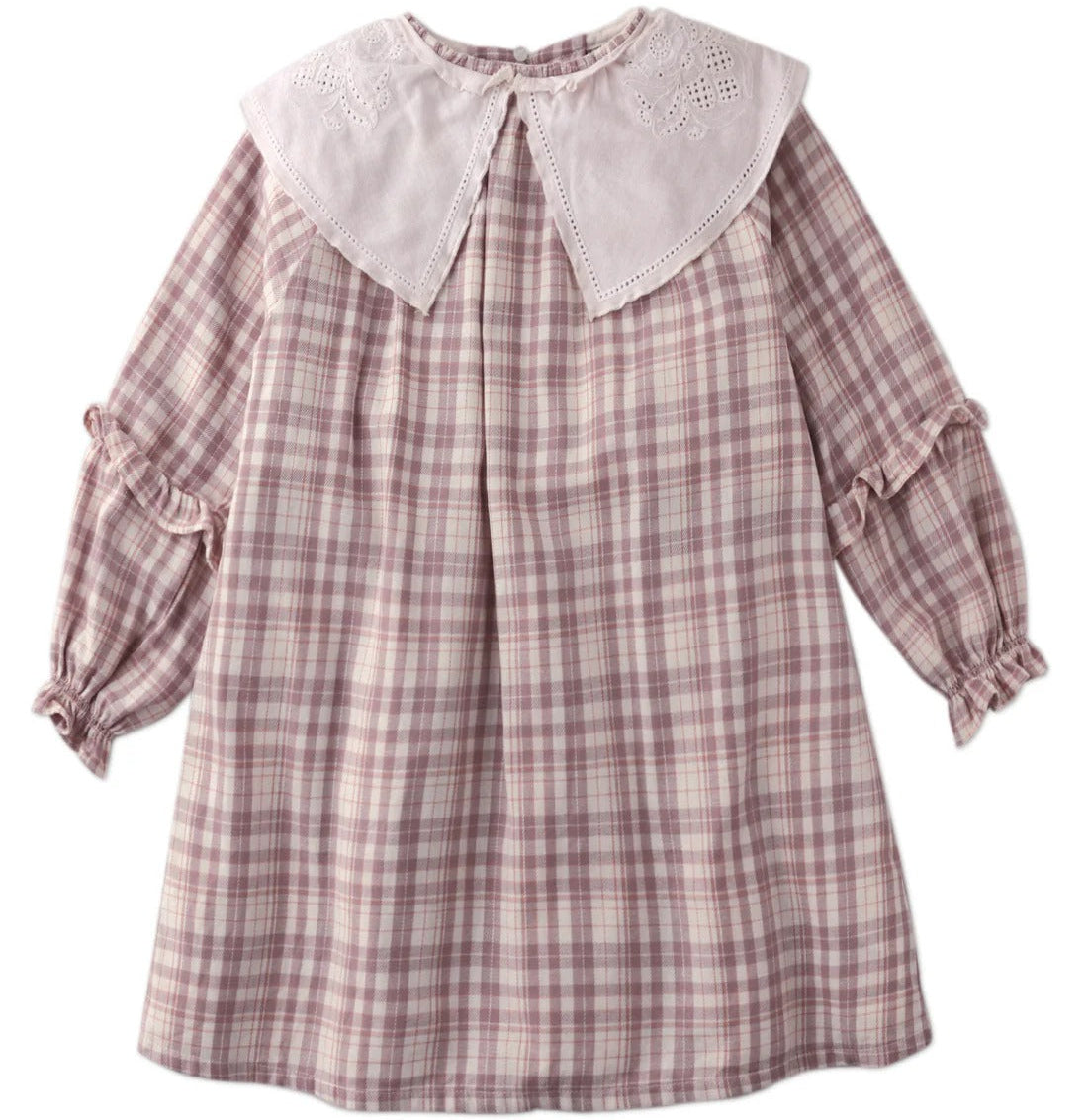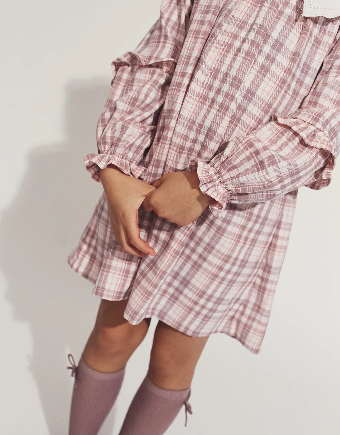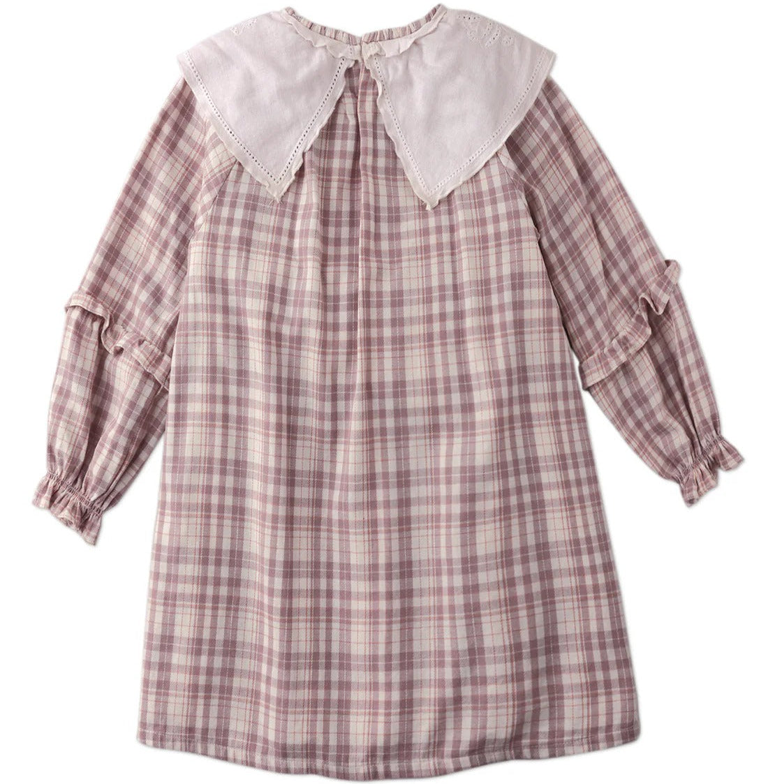 Item: Classic plaid meets whimsical charm with the Reese Long Sleeves Shift Dress, featuring ruffle details and a mini cape with eyelet embroidery for a delightful, timeless look.