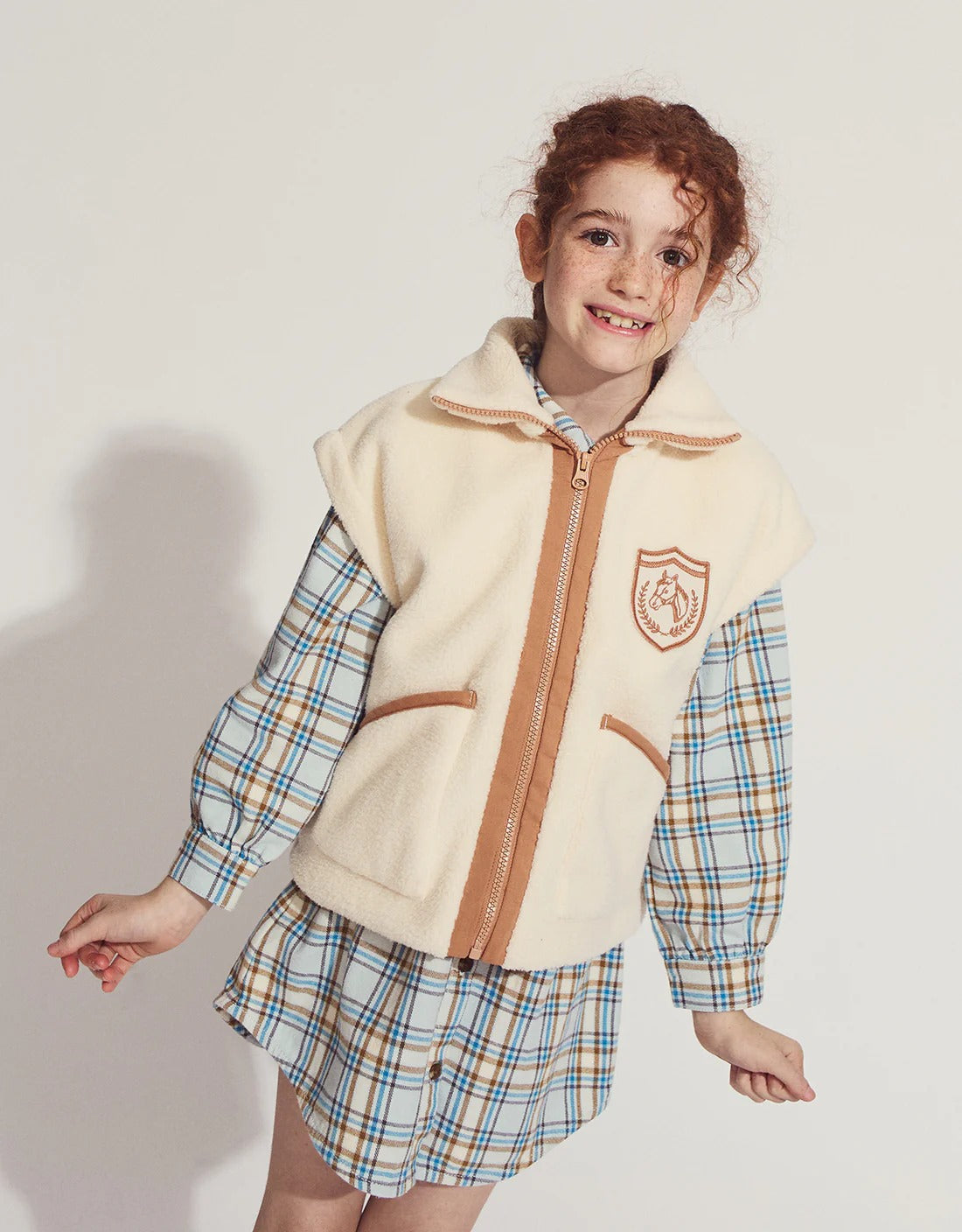 Item: The Juno Gilet in Eggnog, with its playful horse badge and patch embroidery, combines cozy warmth with charming equestrian details, making it a perfect attire for imaginative side quests.