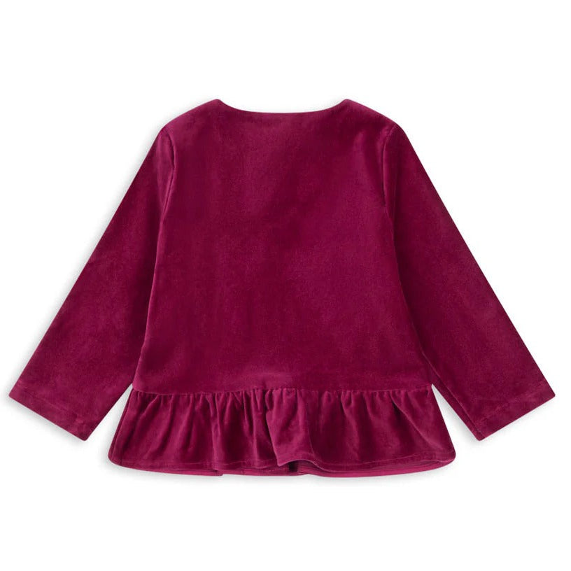 Item: Soft shirt in a heavy velvet fabric that adds a sharp silhouette. Designed with heart shaped front buttons and a decorative peplum skirt.