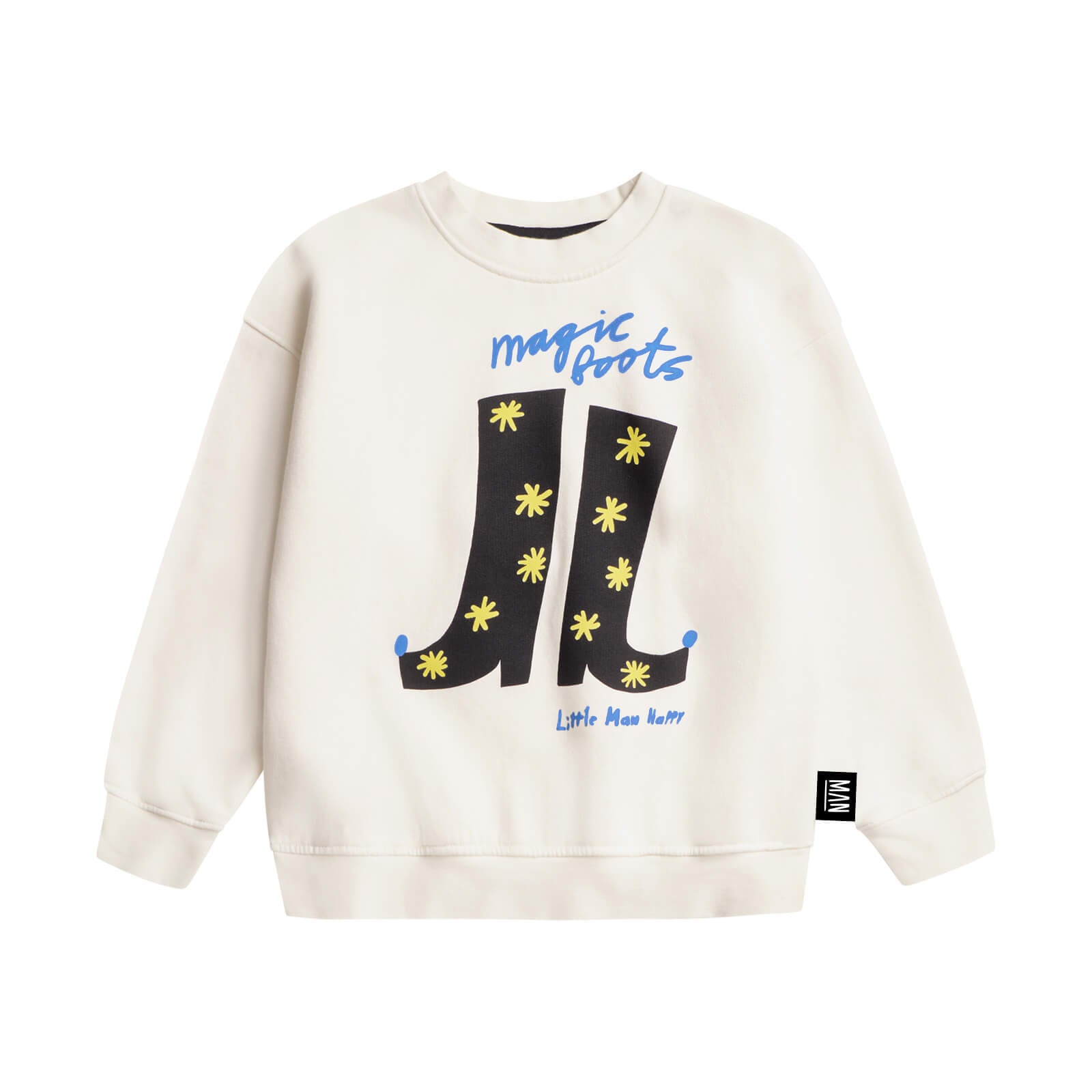 Item: Step into magic. This off-white kids sweatshirt brings a little magic to everyday life. Featuring bold black boots covered in yellow stars and playful “magic boots” lettering in electric blue, it’s made for kids who believe in the extraordinary. A standout design with a touch of imagination – ready to spark stories, smiles, and style.