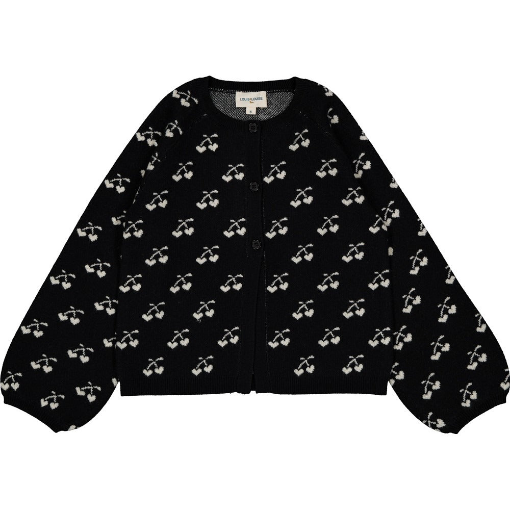 Item: A cozy cardigan in a soft wool blend knitted with contrast threading to create a black-and-cream backdrop, accented by a cherry motif. It features a V-neckline, front buttons, and ribbed hems and cuffs for a polished, snug finish.