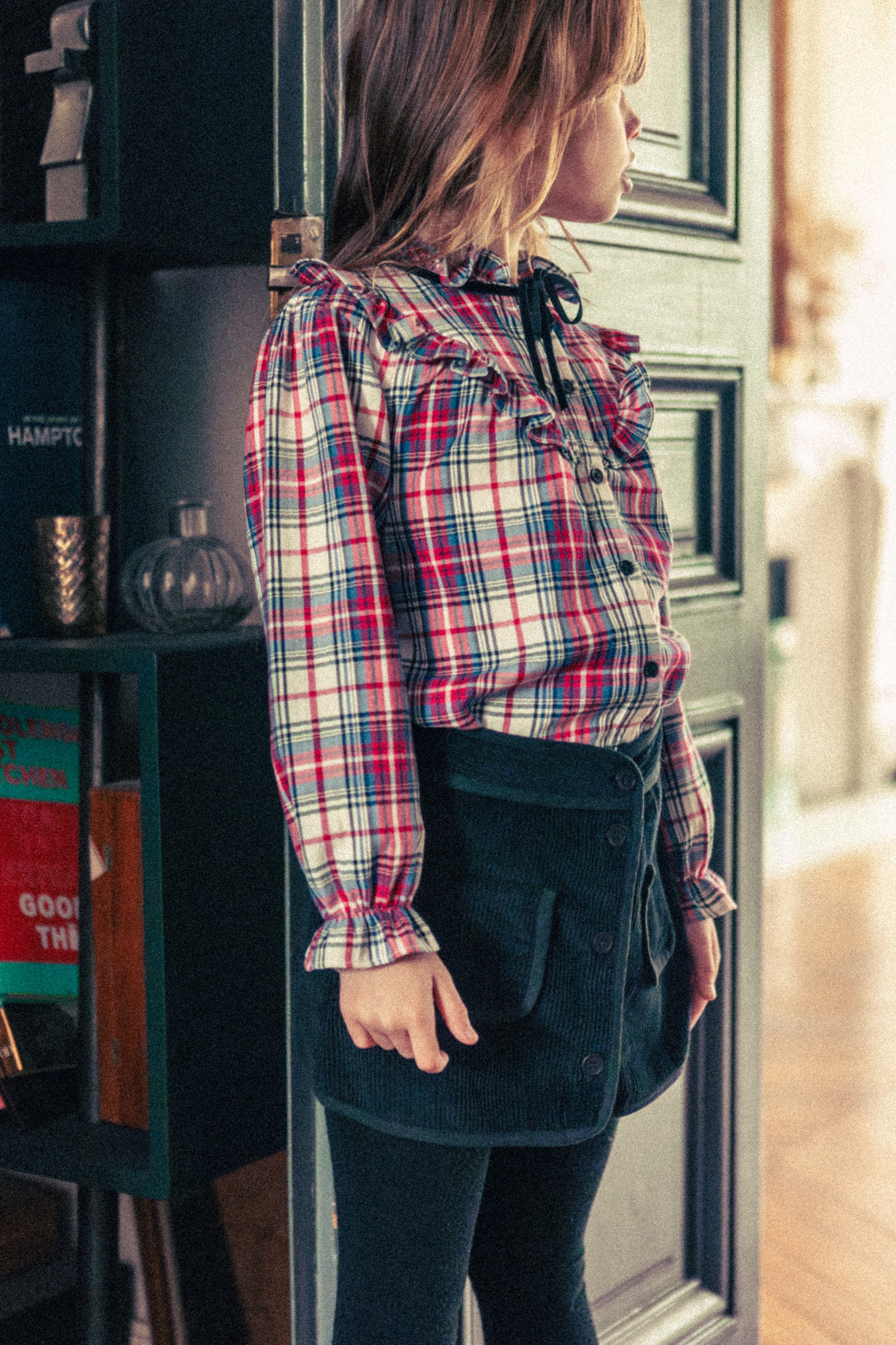 Item: A lightweight twill tunic in a classic tartan plaid of off-white with red accents. It has a relaxed, breezy silhouette that drapes gently, and features a round neckline with a hidden placket or buttons for easy wear. The style captures a mix of casual and refined — perfect for layering over leggings or pairing with boots.