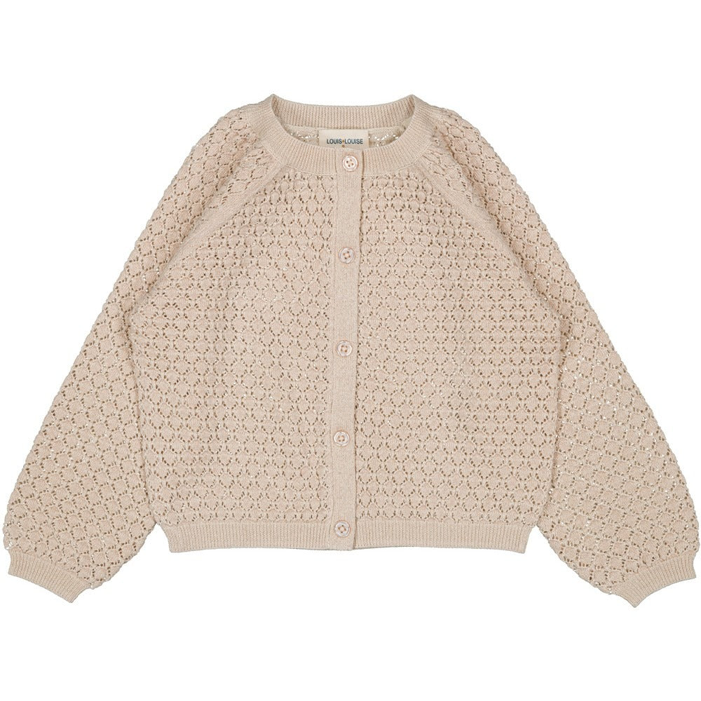 Item: A round-neck cardigan crafted in a soft wool-cotton blend with shimmering gold lurex accents woven through a speckled pointelle knit.