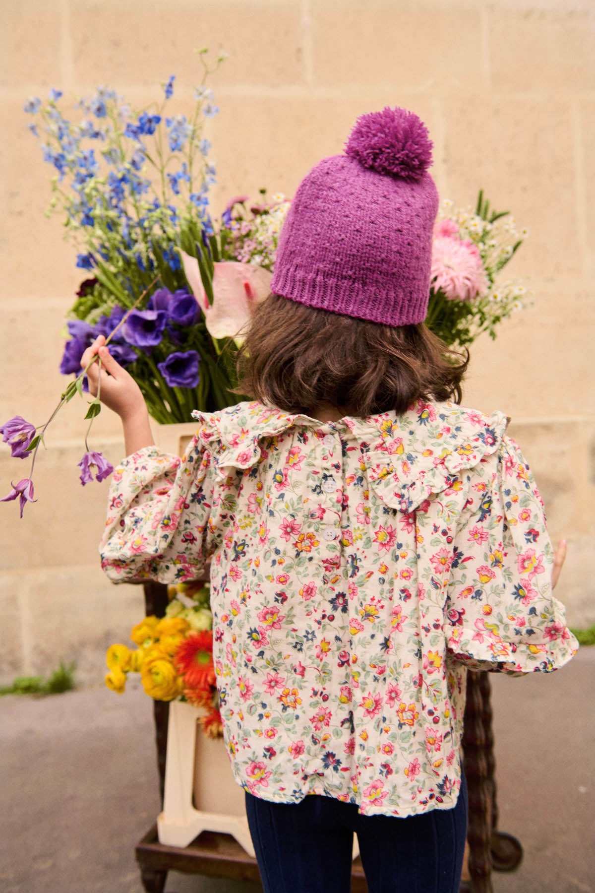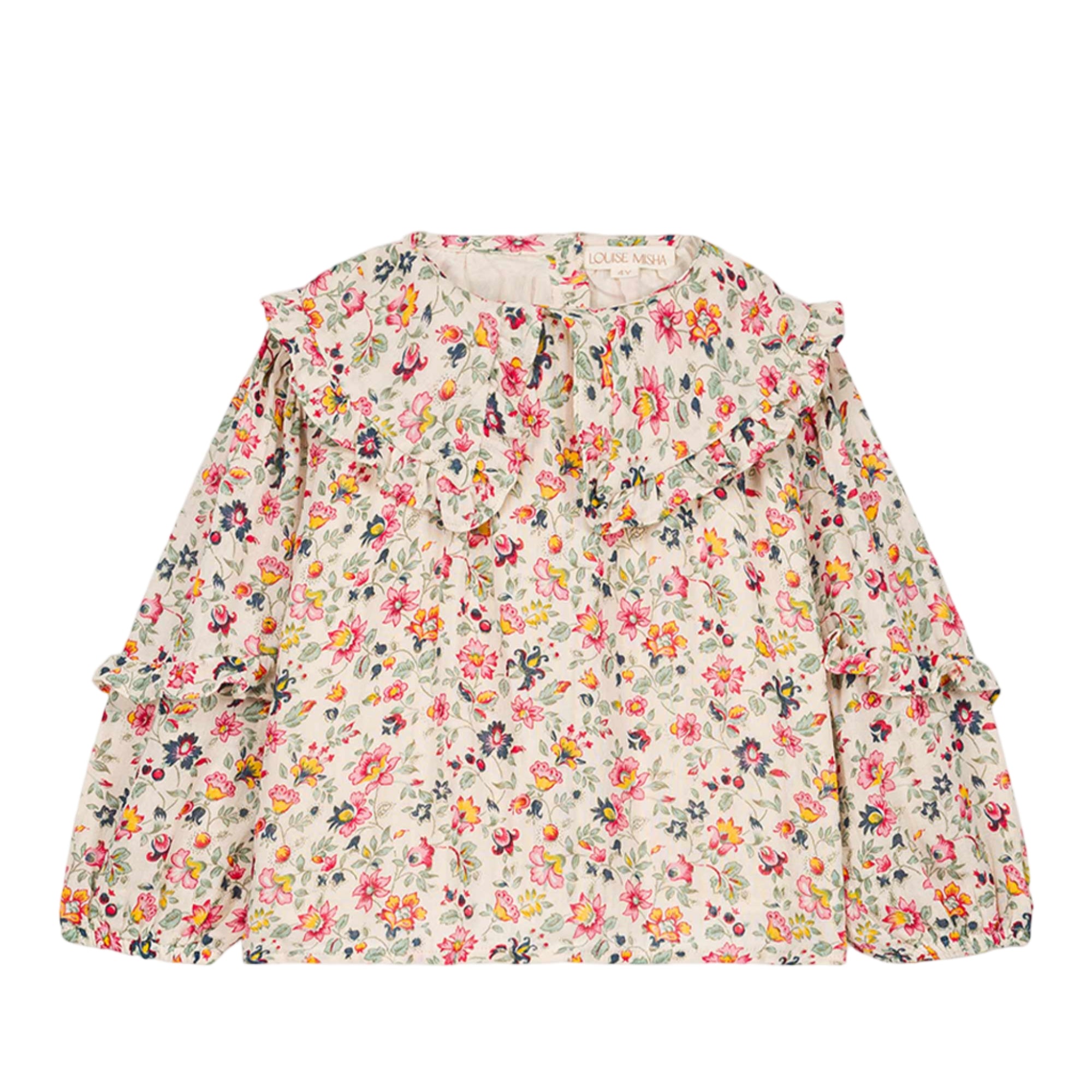 Item: The Cleo Blouse in Cream Wild Flowers by Louise Misha is a charming floral blouse crafted from double cotton gauze, featuring a large ruffled collar, puffed sleeves with ruffled details and elasticized cuffs, and a button placket at the back.