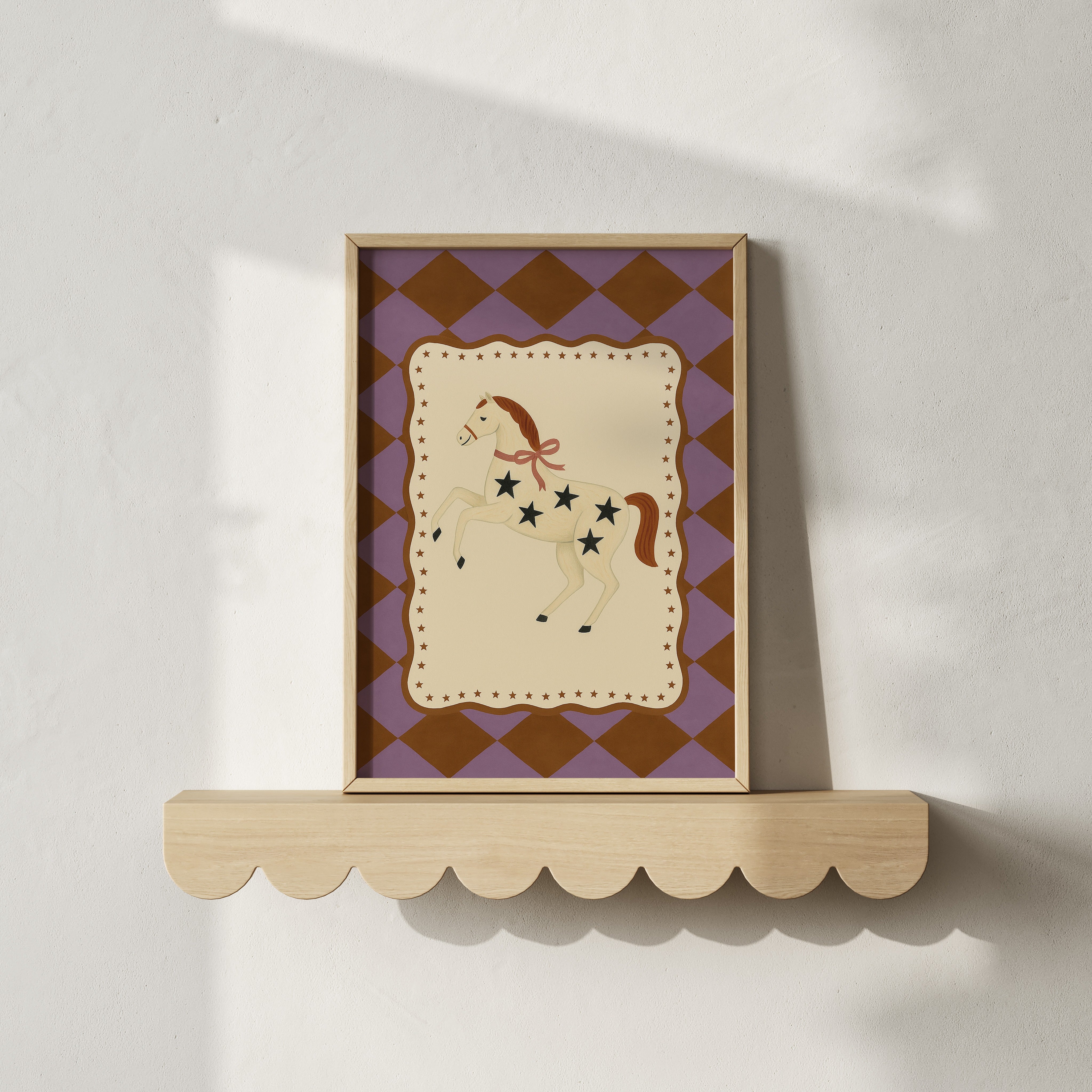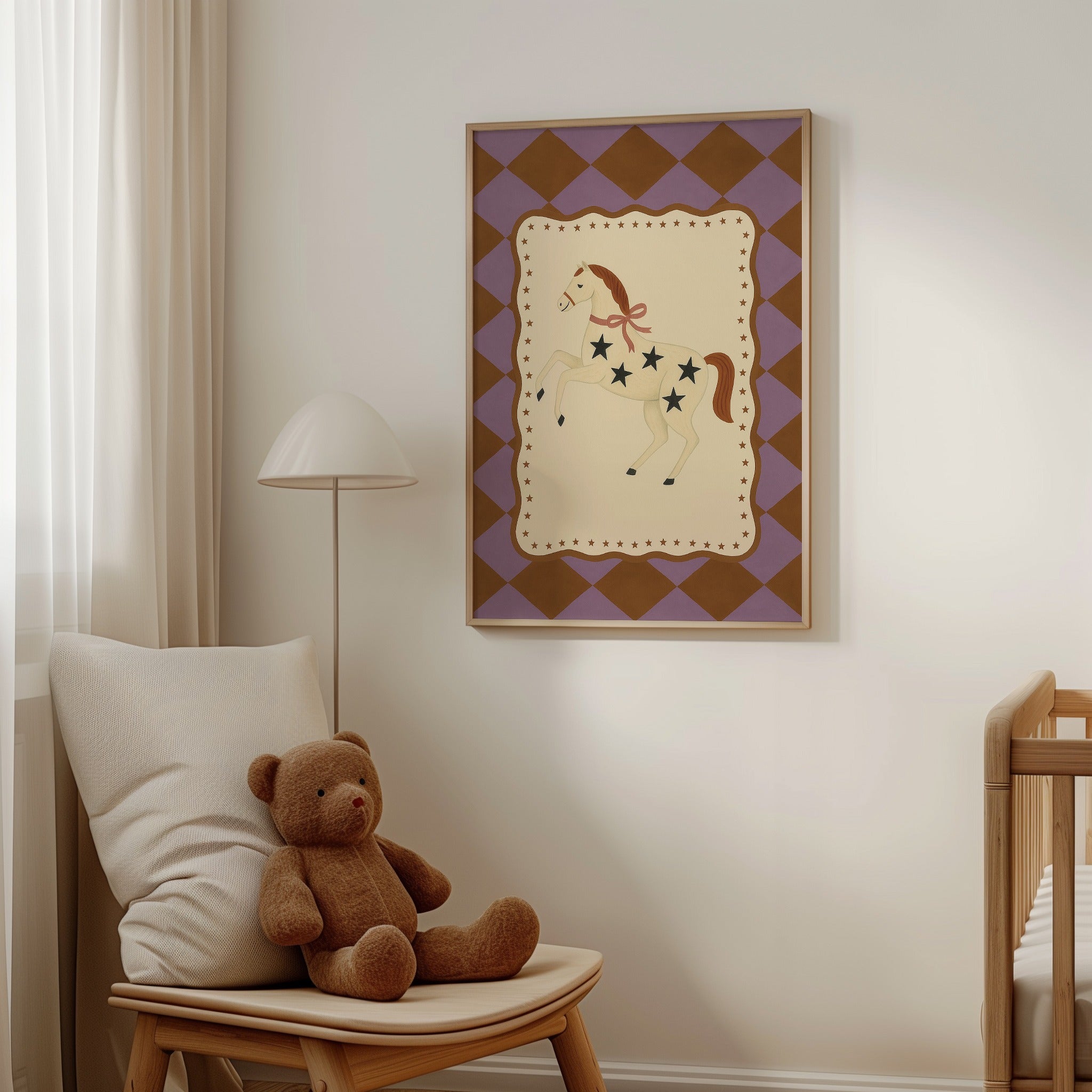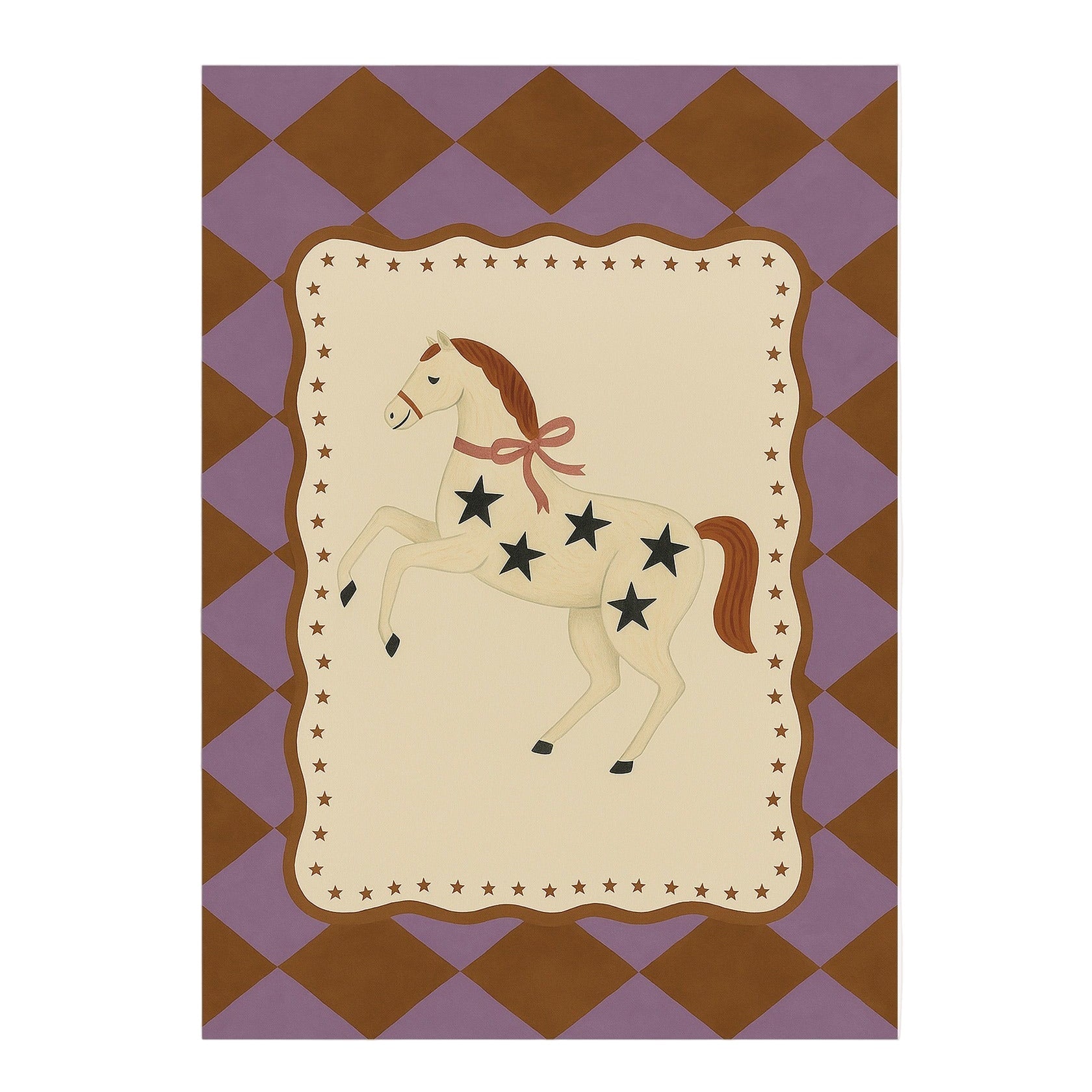 Item: A vintage-style poster of a prancing cream pony with black star markings and a pink bow, centered on a scalloped cream panel with a tiny star border and framed by a mauve-and-terracotta harlequin diamond pattern.