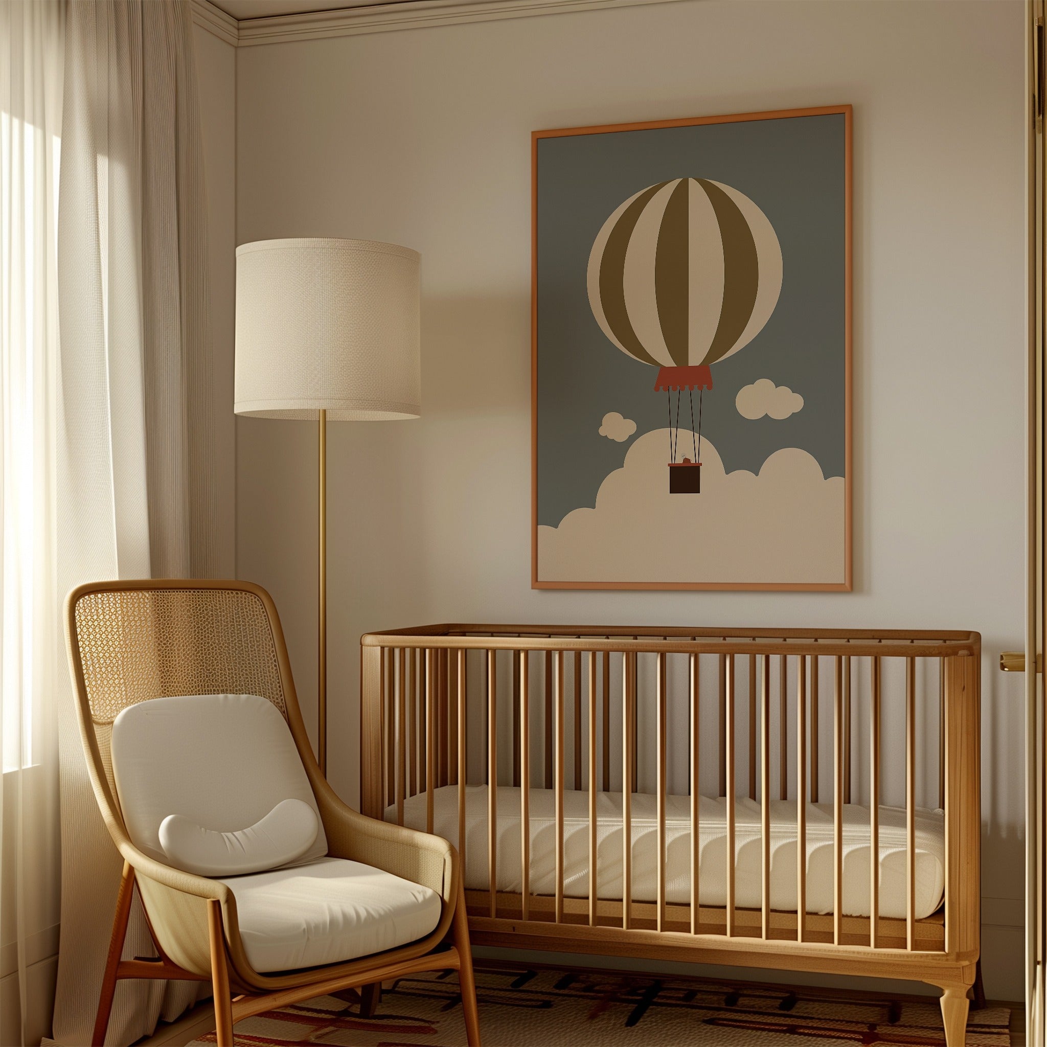Item: A minimalist poster of a striped hot-air balloon drifting above cream clouds in a dusky blue sky, rendered in warm neutral tones.