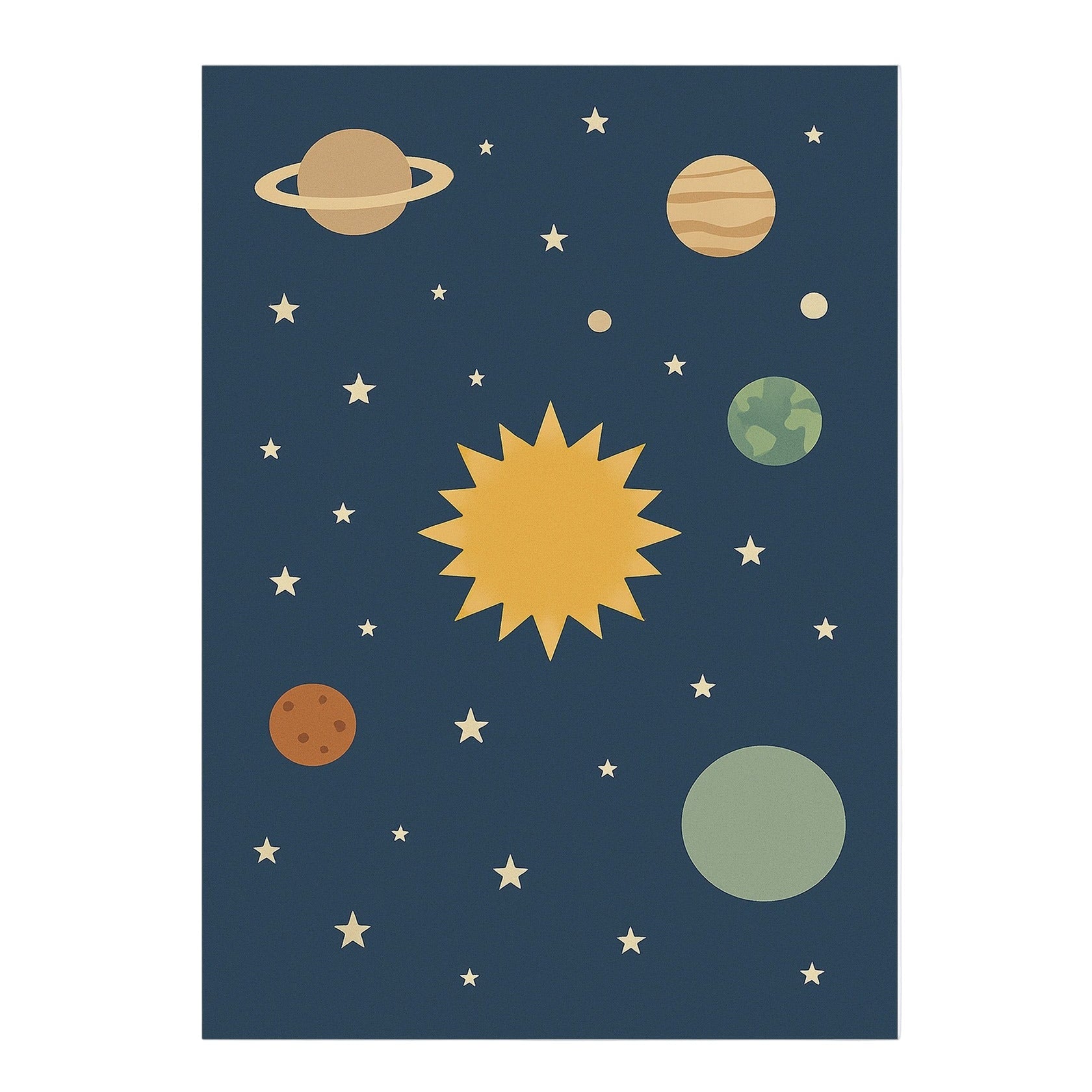 Item: A playful navy poster featuring a golden sun, a ringed planet, an Earth-like world, and other simple planets scattered among cream stars—clean, minimal space art for kids’ rooms.