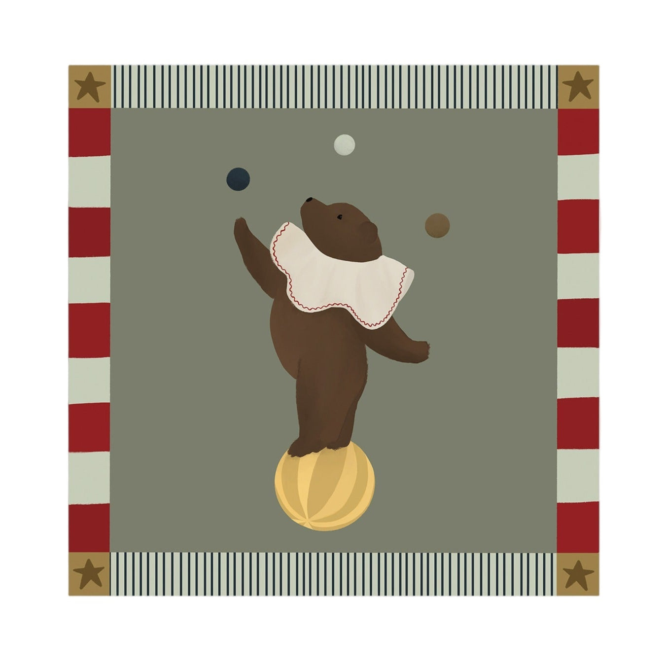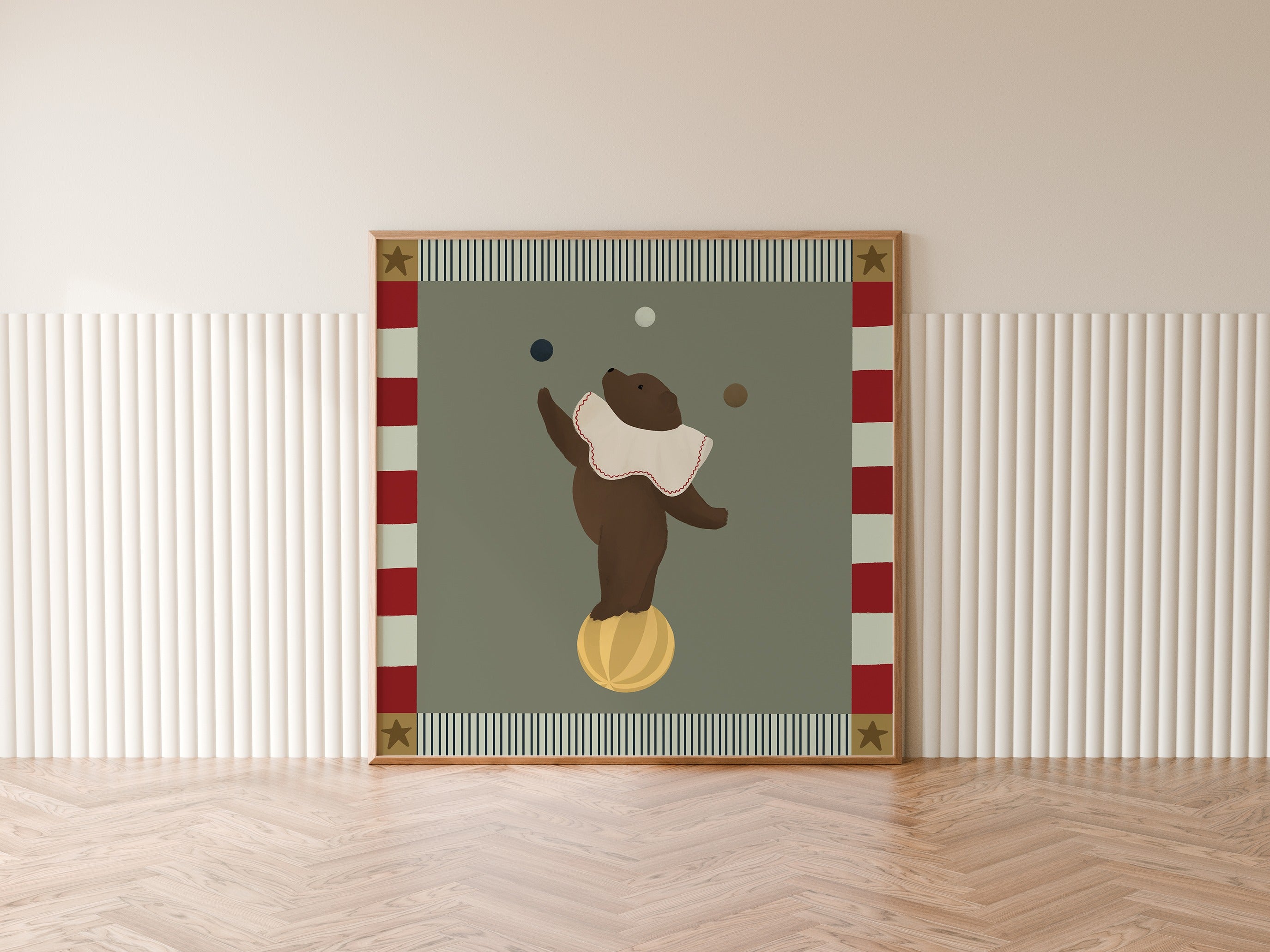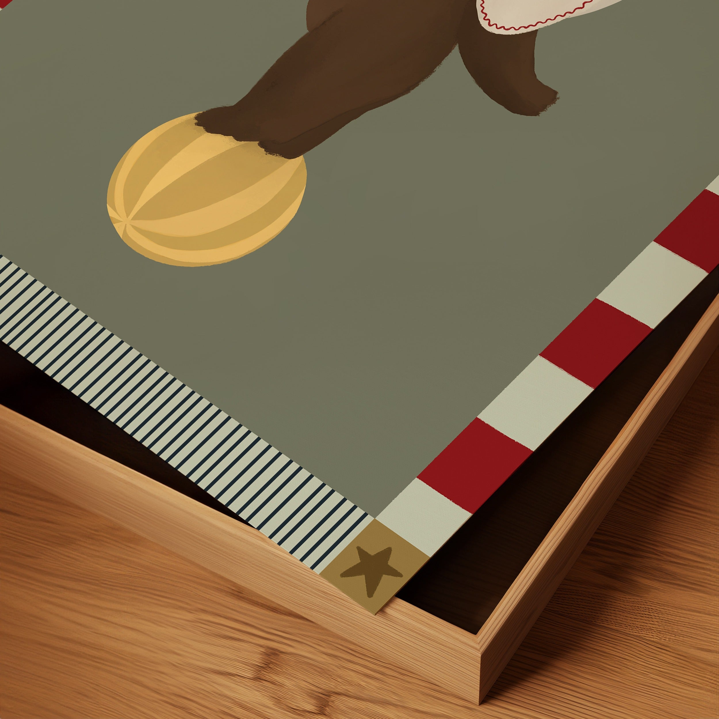 Item: A vintage circus-style poster of a brown bear in a ruffled collar balancing on a yellow ball and juggling, set against a muted sage backdrop with a red-and-cream striped border and gold-star corners.