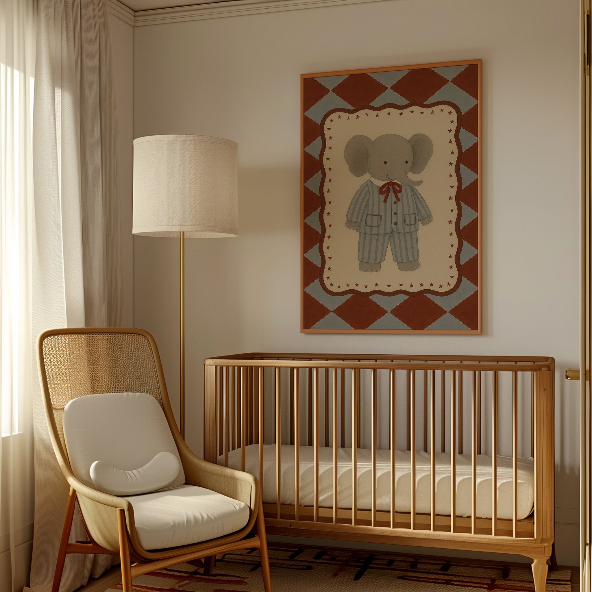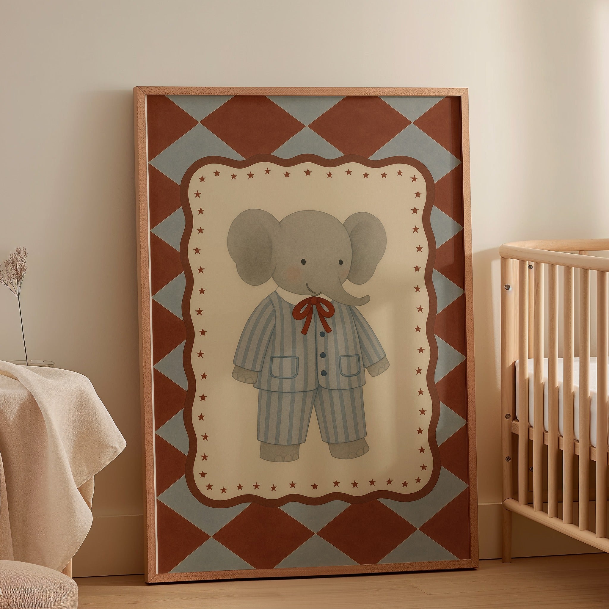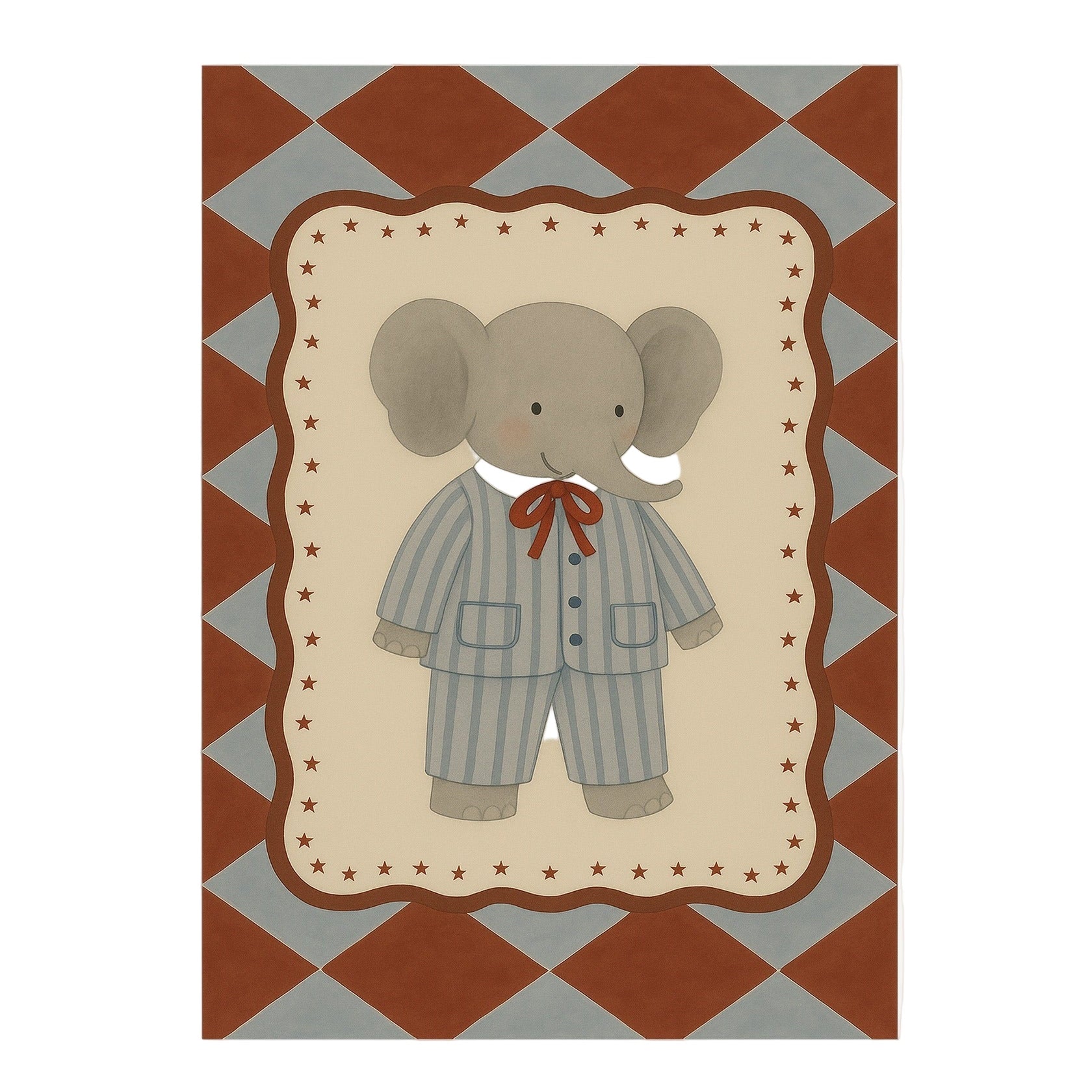 Item: A vintage-style poster featuring a cute elephant in a blue-striped suit with a red bow, framed by a scalloped cream border dotted with stars and a terracotta-and-dusty-blue diamond pattern.